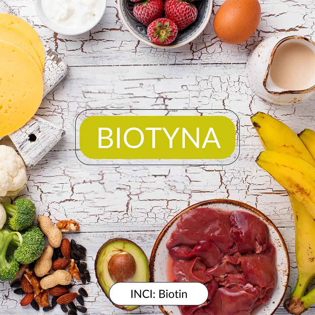 Inaczej witamina B7, nazywana również “witaminą piękna”. W naszym organizmie jest niezbędnym składnikiem wielu procesów metabolicznych, służy jako budulec i źródło energii. Wzmacnia błony śluzowe, układ odpornościowy i nerwowy, serce oraz naczynia krwionośne. Ma również znaczący wpływ na kondycję skóry, włosów i paznokci, dlatego znajduje zastosowanie zarówno w suplementach diety, jak i wielu kosmetykach.