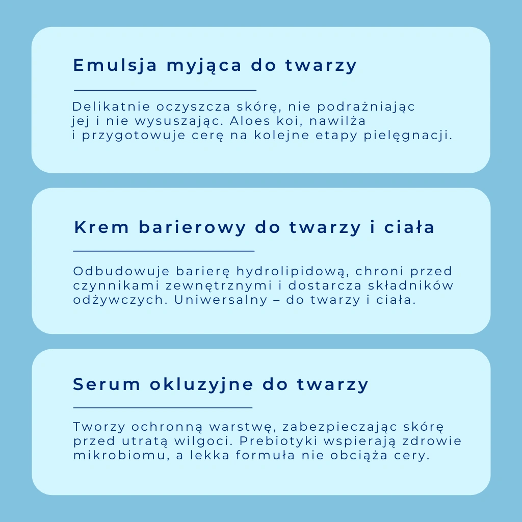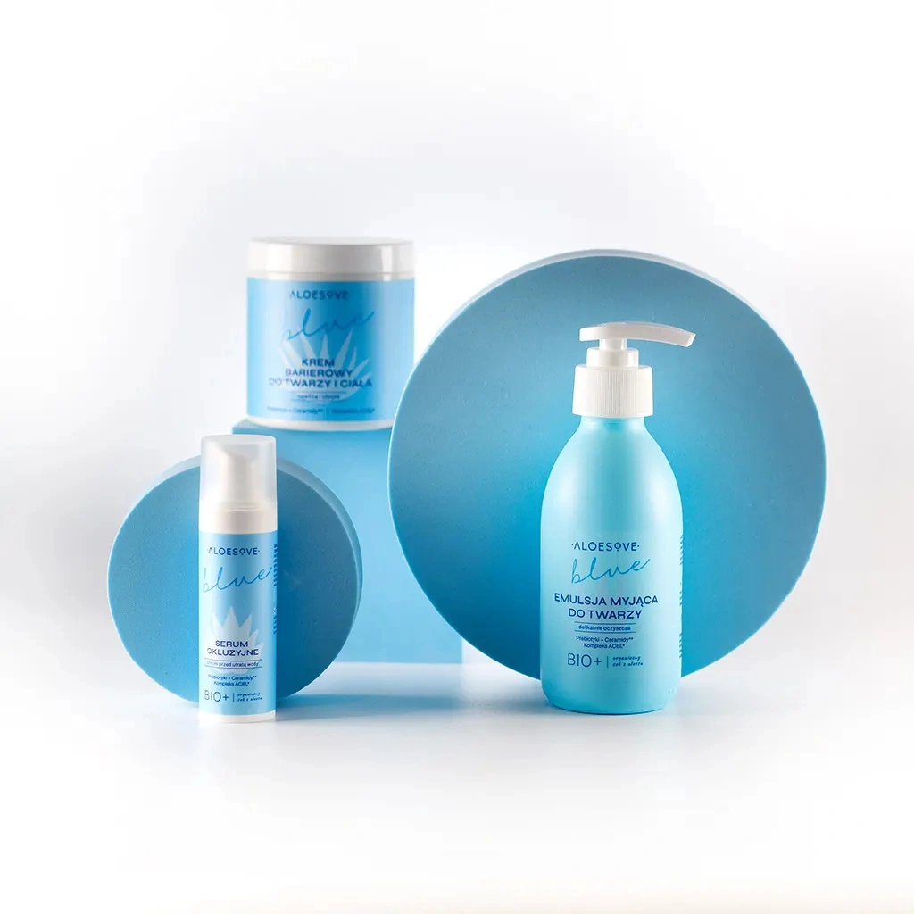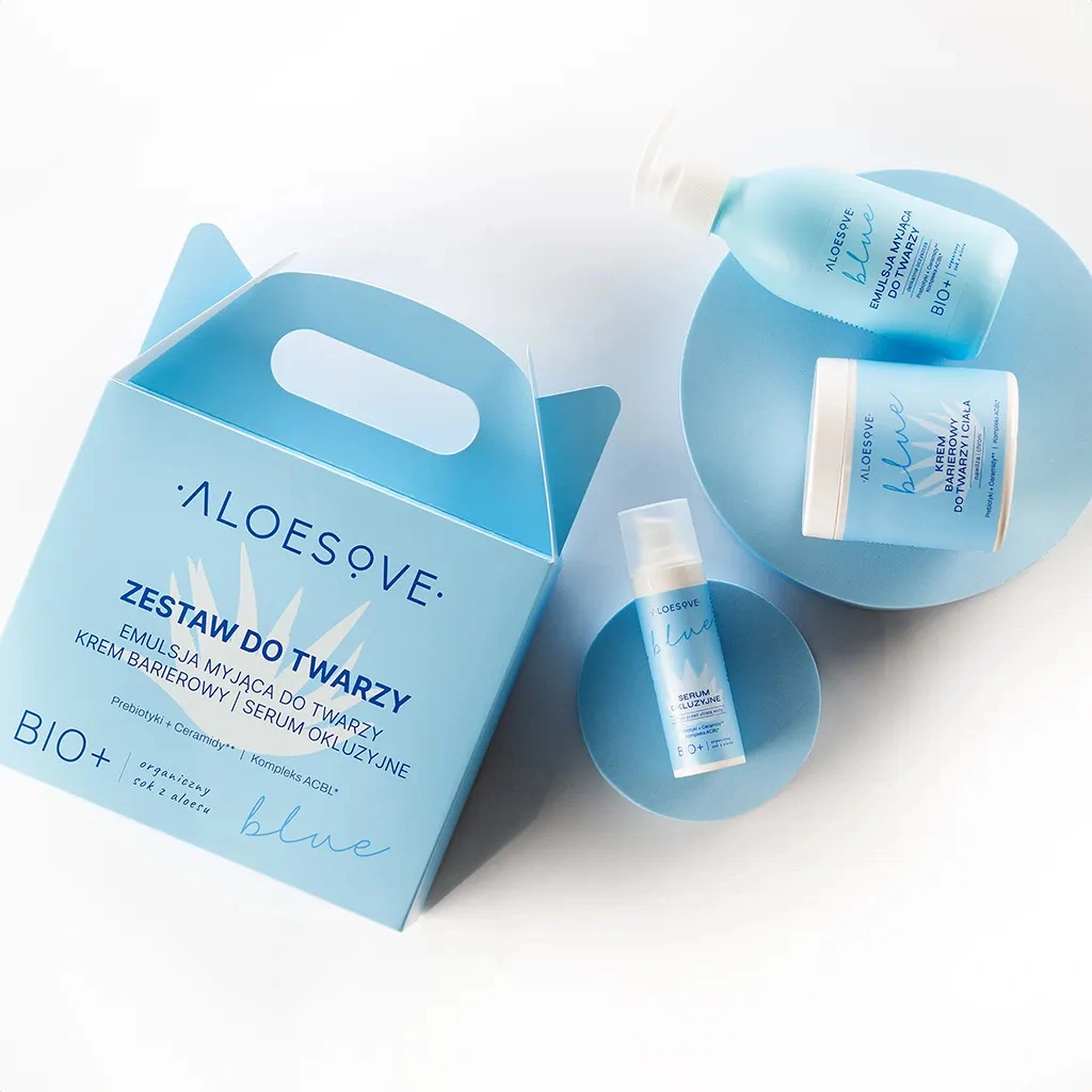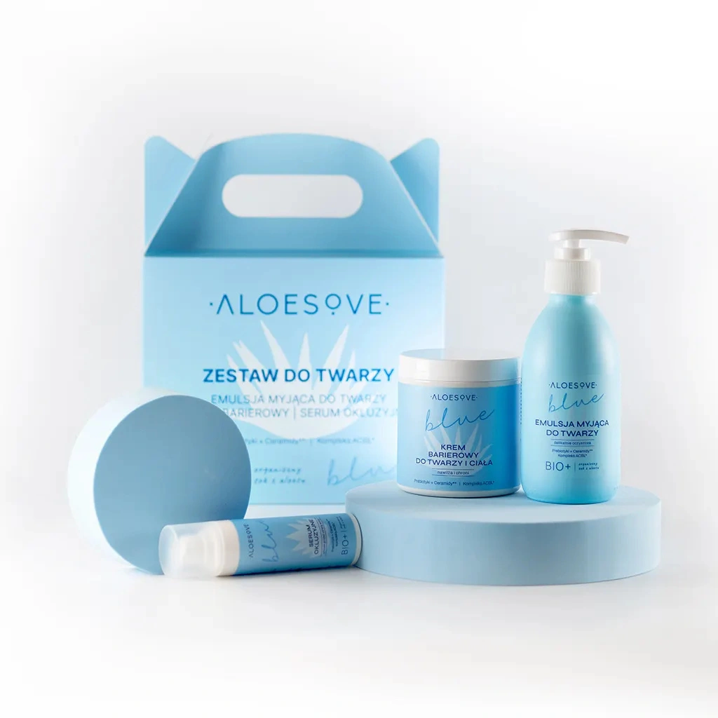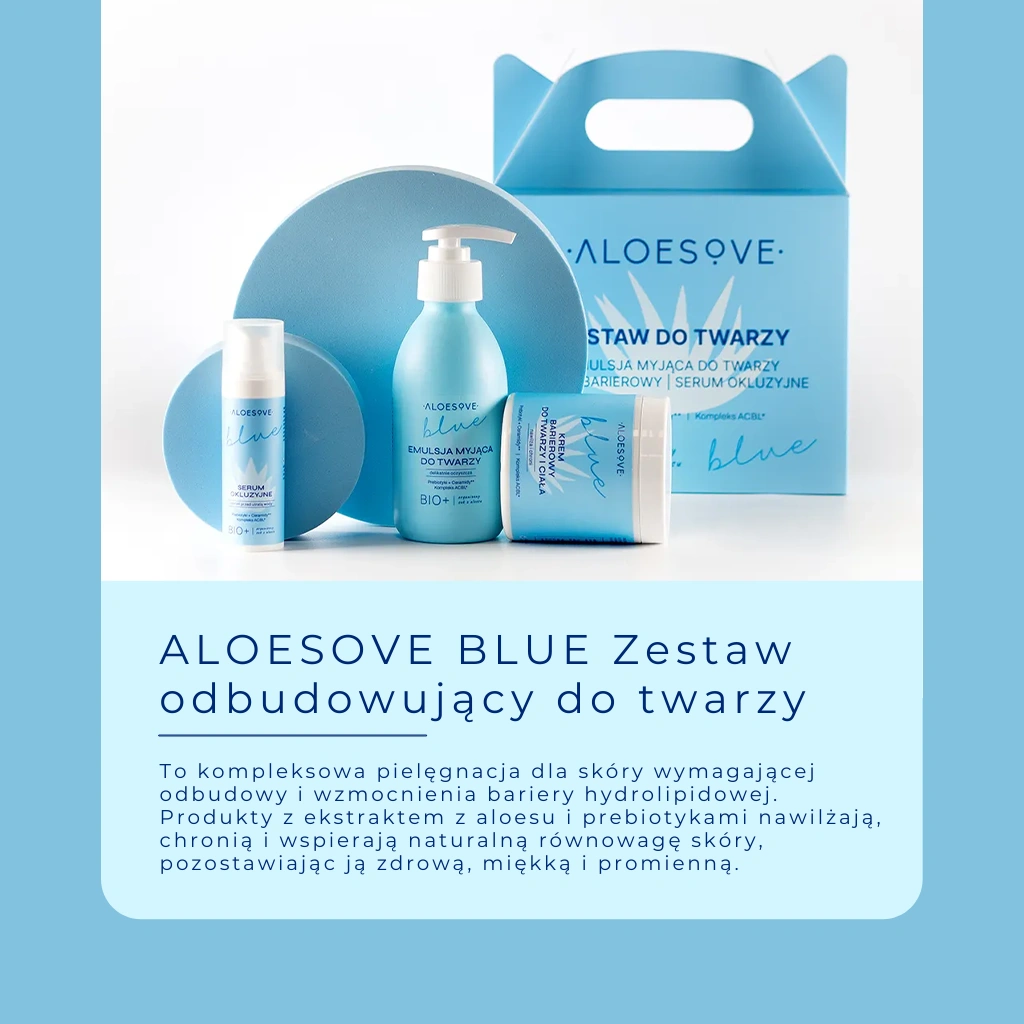 Zestaw ALOESOVE BLUE to wsparcie na każdym etapie pielęgnacji skóry. Emulsja myjąca delikatnie oczyszcza i koi cerę, krem barierowy odbudowuje naturalną ochronę skóry twarzy i ciała, a serum okluzyjne tworzy warstwę zabezpieczającą przed utratą wilgoci. Dzięki synergicznemu działaniu tych produktów, skóra staje się miękka, elastyczna i pełna blasku.