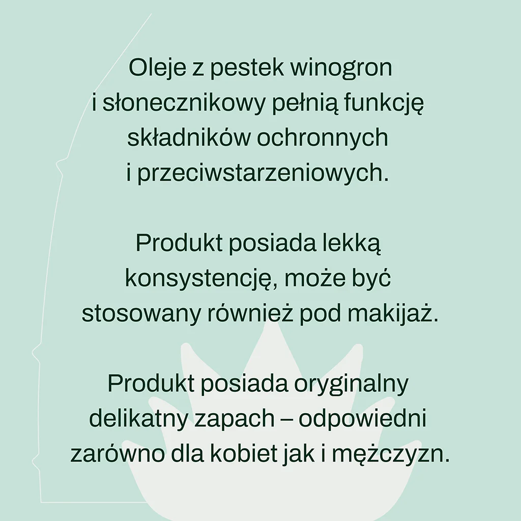 Przeznaczony do codziennej pielęgnacji każdego typu cery. Zawiera oleje roślinne o cennych właściwościach regenerujących i przeciwstarzeniowych (z wiesiołka, jojoba i z pestek winogron). Masło Shea, koenzym Q10 w połączeniu z alantoiną odżywiają i wspomagają odnowę komórkową. Składniki o silnym potencjale antyoksydacyjnym ACGG* i EGCG** wspierają naturalną ochronę i regenerację skóry.