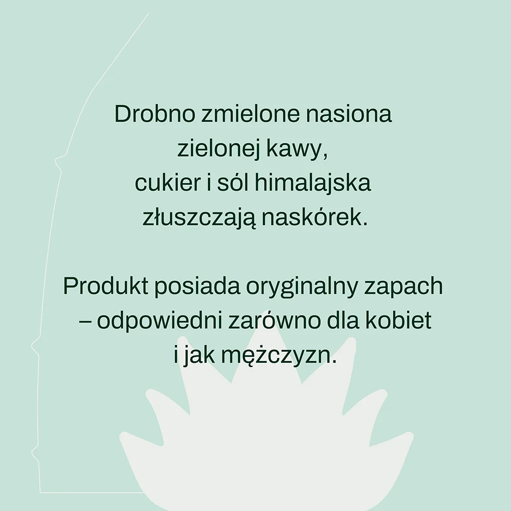 Peeling do ciała z drobno zmielonymi nasionami zielonej kawy, cukrem i solą himalajską. Skutecznie złuszcza martwy naskórek, pomaga w walce z cellulitem, ujędrnia i wygładza skórę.