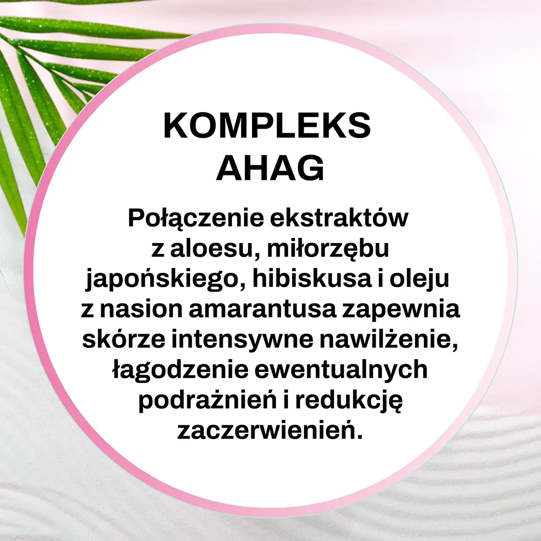 Zawarty w mgiełce kompleks AHAG to połączenie ekstraktów z aloesu, miłorzębu japońskiego, hibiskusa i oleju z nasion amarantusa. Działa wielokierunkowo, intensywnie nawilżając skórę, łagodząc podrażnienia i redukując zaczerwienienia, co sprawia, że jest idealny dla osób poszukujących produktów o działaniu przeciwzapalnym i regenerującym.