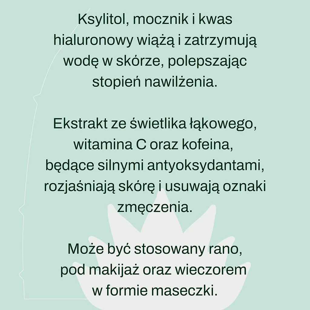 Bezolejowy żel Intensywnie nawilża i ujędrnia. Szybko się wchłania i może być stosowany rano, pod makijaż, wieczorem oraz w formie maseczki niwelującej opuchnięcia.