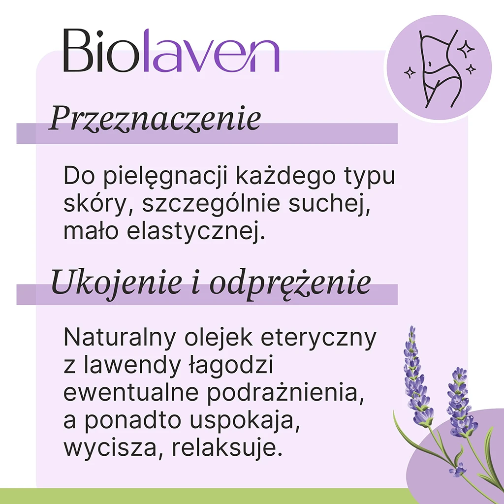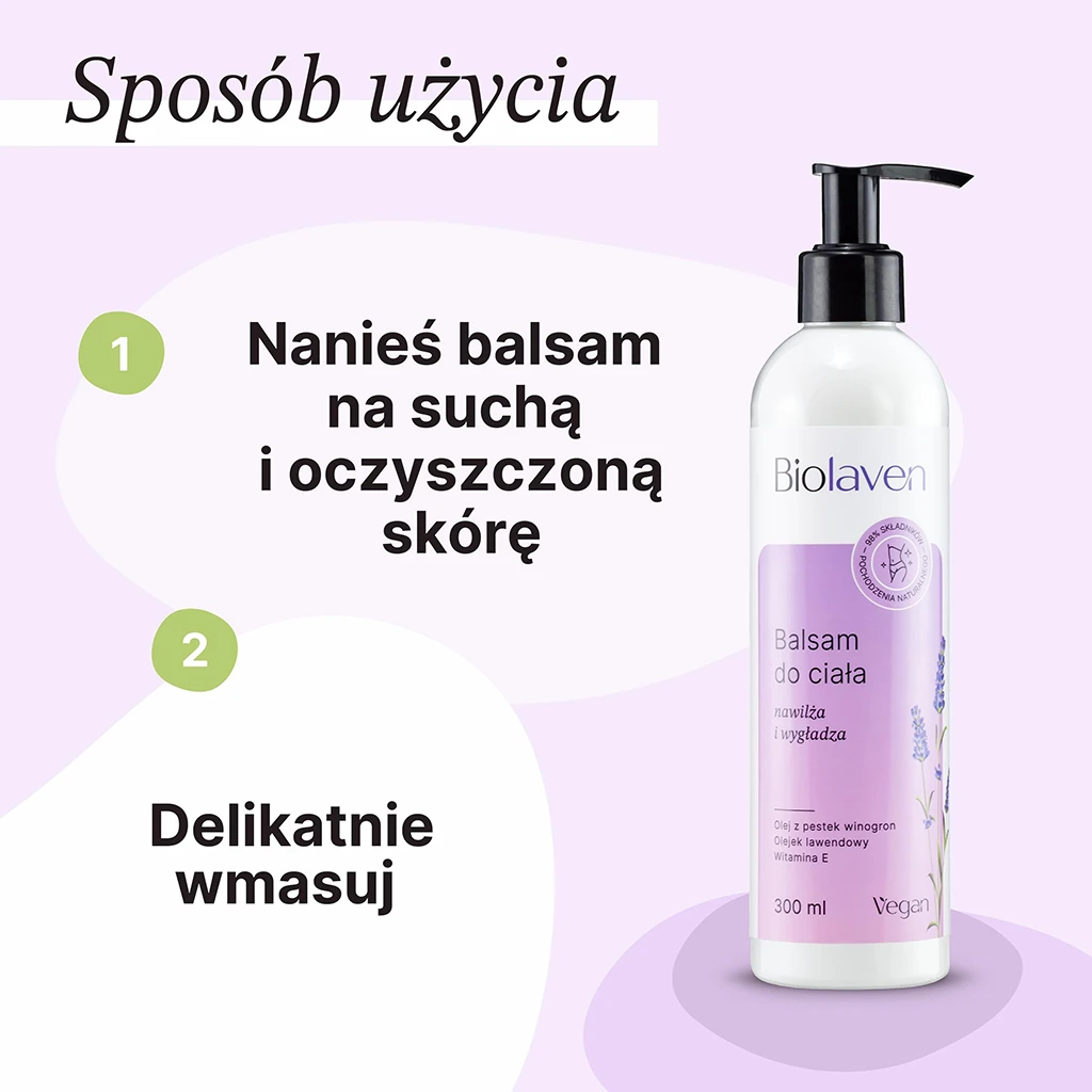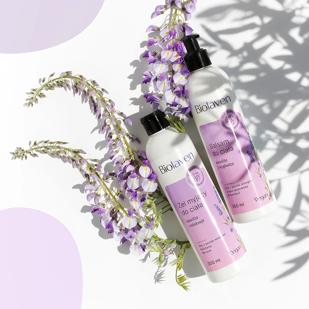 Balsam zawiera naturalny olejek eteryczny z lawendy, który łagodzi podrażnienia skóry, uspokaja, wycisza i relaksuje. Jego niezwykły, lawendowo-winogronowy zapach gwarantuje chwilę wytchnienia podczas codziennej pielęgnacji. Przyjemny aromat długo utrzymuje się na skórze.