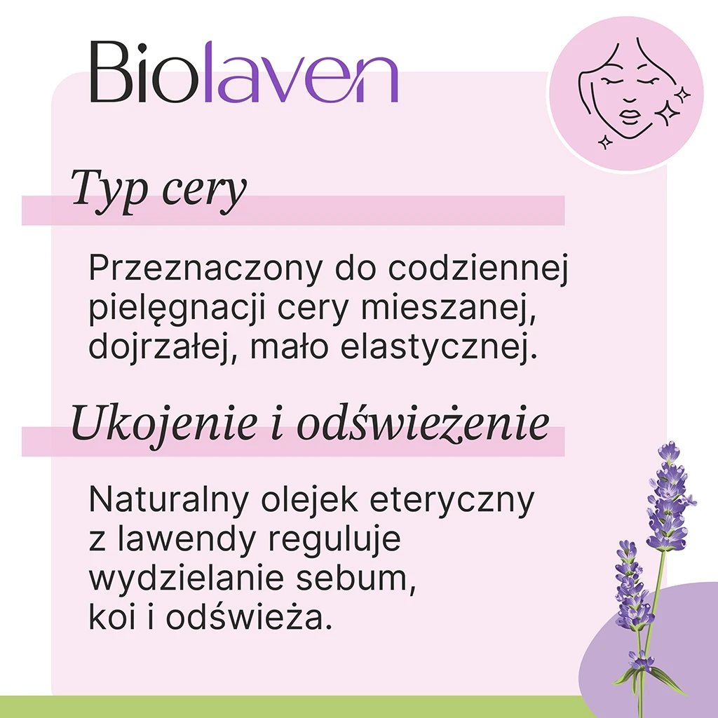 Naturalny krem do twarzy BIOLAVEN został stworzony z myją o codziennej pielęgnacji każdego typu cery, szczególnie mieszanej, dojrzałej i mało elastycznej. To bogactwo naturalnych składników, które przywrócą Twojej skórze jędrność i młody, promienny wygląd.