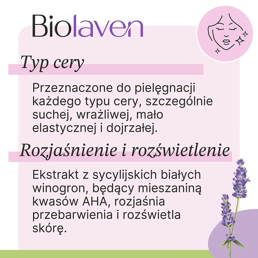 Nowość Biolaven, która najbardziej mnie zaciekawiła. Mamy tu połączenie najważniejszych dla skóry składników: emolienty, humektanty, kwasy, antyoksydanty, witaminy i ceramidy. Maseczkę stosuję nakładając wieczorem grubszą warstwę i zmywam po około 20 minutach. Po użyciu zauważalne są lekkie złuszczenie, wygładzenie, nawilżenie, zmiękczenie i odżywienie skóry. Co mnie zaskoczyło to niesamowita fuzja zapachów. Podczas nakładania maseczki dominuje zapach winogron, a podczas zmywania pałeczkę przejmuje zapach lawendy. Polecam!