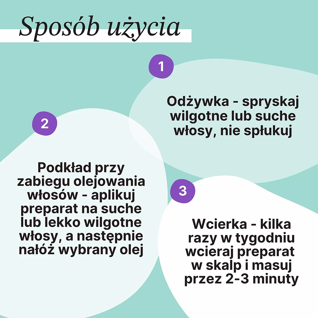 Odżywka nie wymaga spłukiwania, co daje Ci większą wygodę i znacznie przyspiesza codzienną pielęgnację. Możesz stosować jej na całej długości włosów, a także jako wcierkę na skórę głowy.