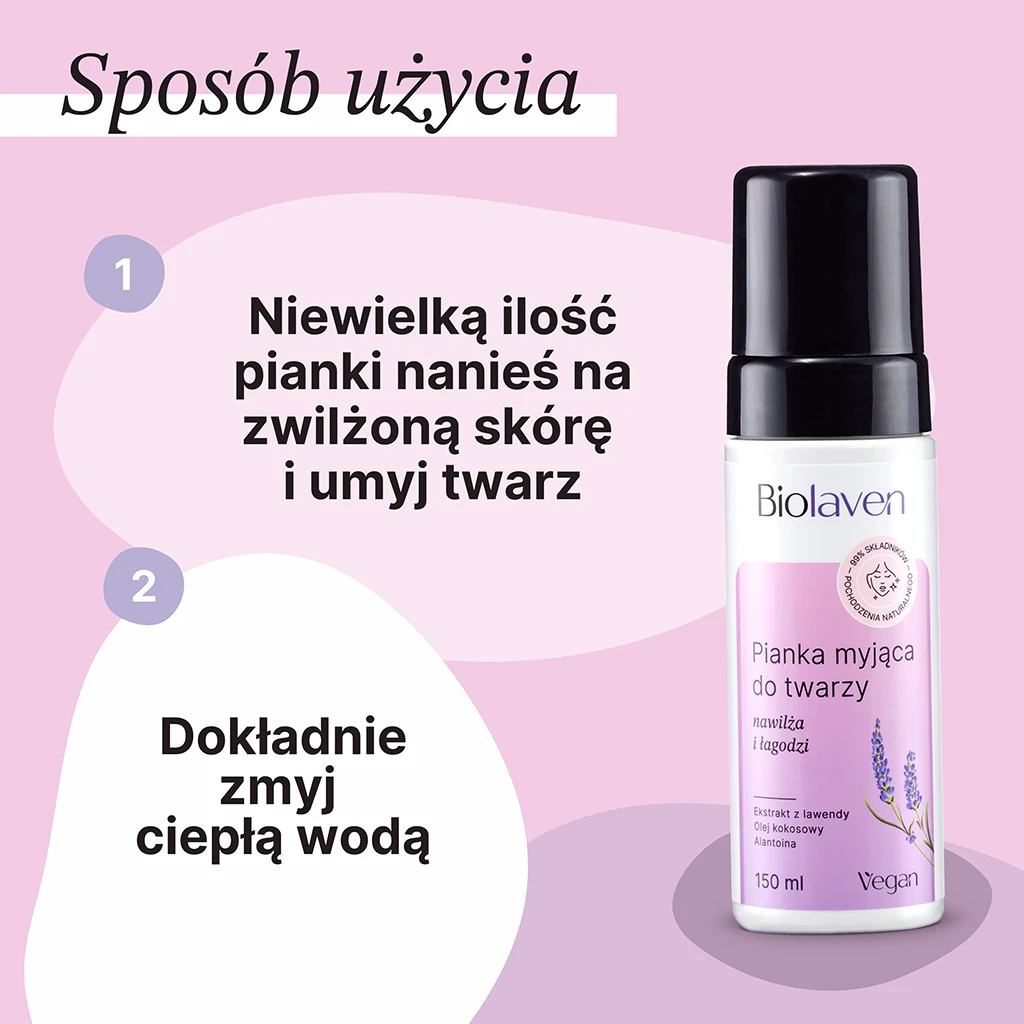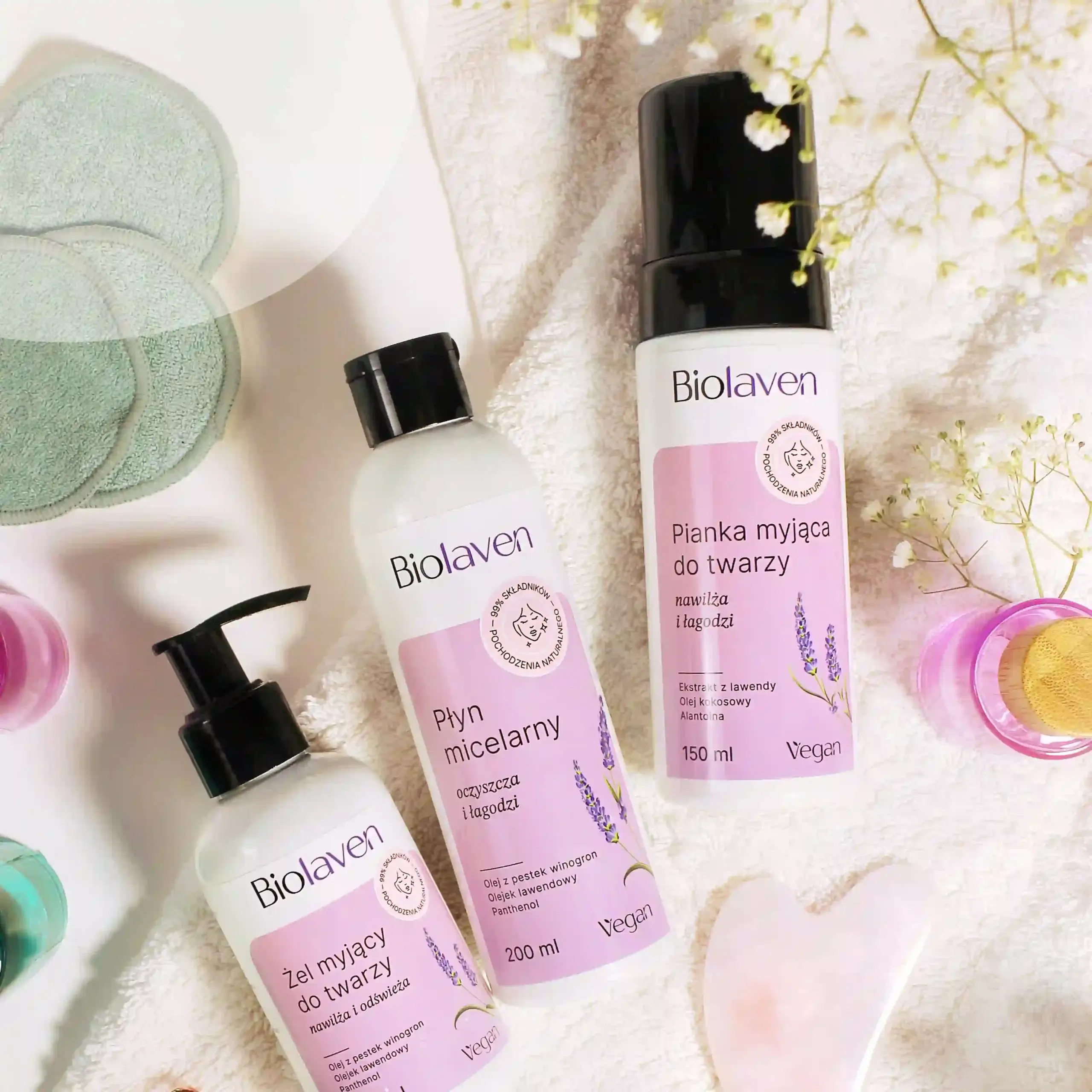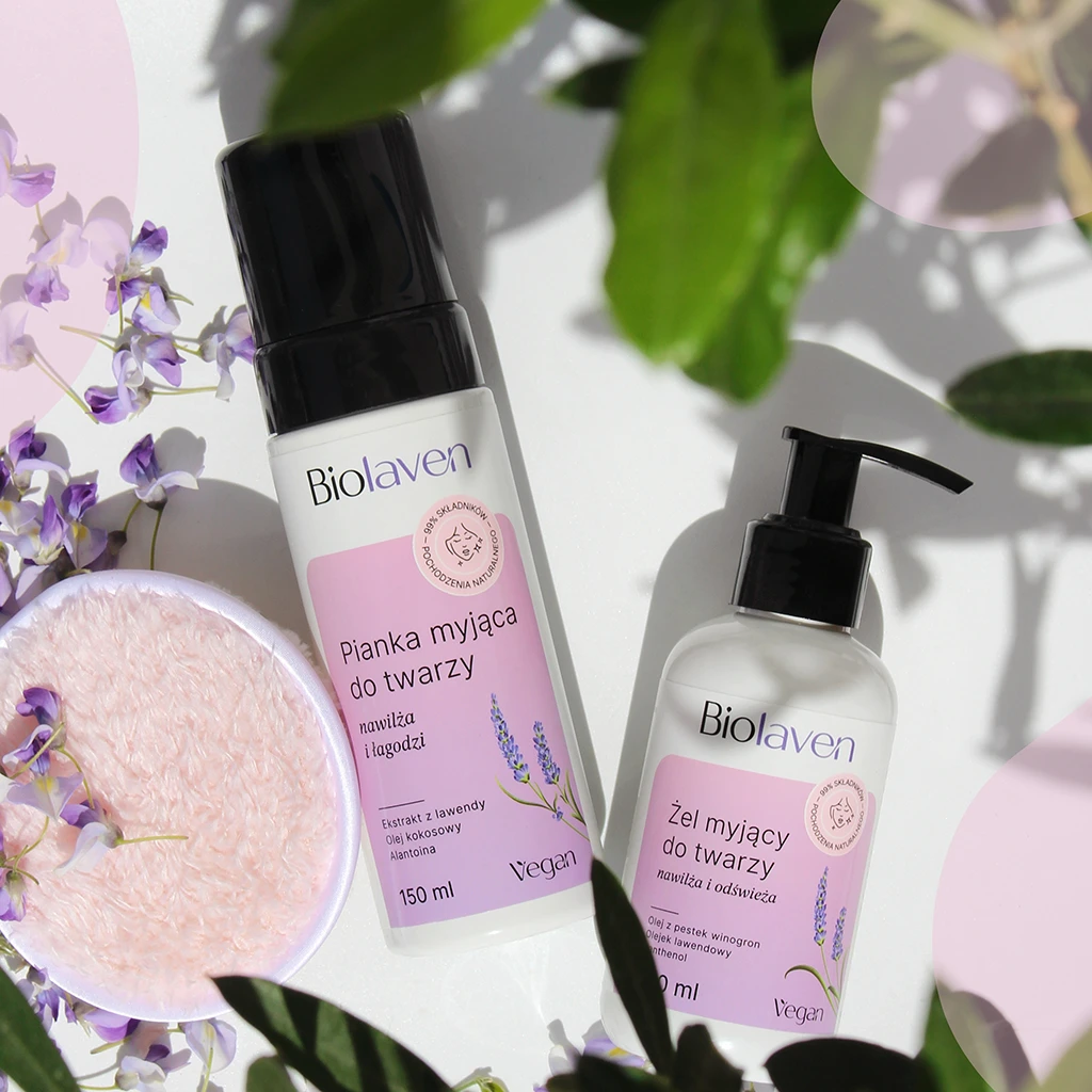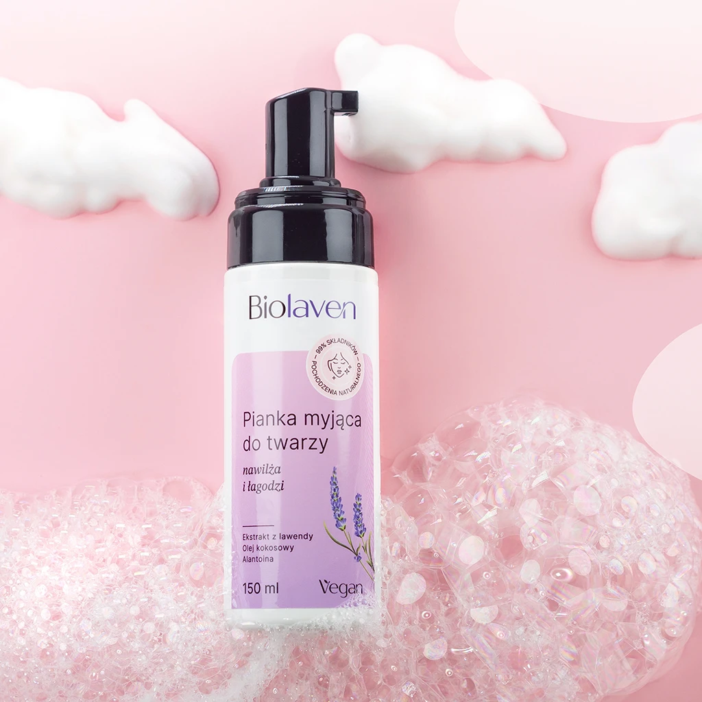 Twoja skóra zasługuje na najlepszą pielęgnację, dlatego stworzyliśmy naszą Piankę do twarzy BIOLAVEN. Bez względu na typ cery, nawet jeśli jest wrażliwa, nasza pianka zapewni Ci delikatne, ale skuteczne oczyszczenie bez podrażnień i uczucia pieczenia.