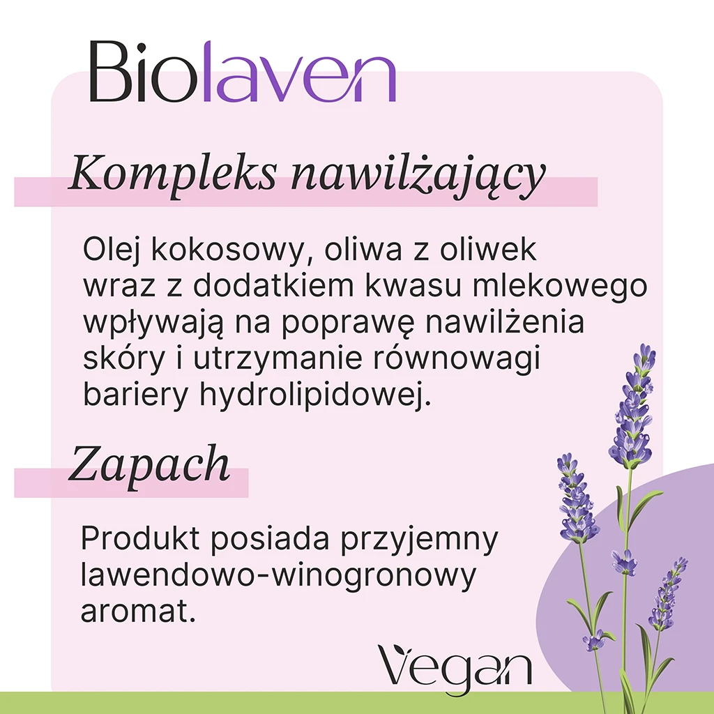 Skład INCI | Allantoin, Aqua, Citric Acid, Cocamidopropyl Betaine, Coco-Glucoside, Cocos Nucifera Oil, Glyceryl Oleate, Lactic Acid, Lavandula Angustifolia Extract, Olea Europaea Fruit Oil, Parfum, Saccharide Isomerate, Sodium Benzoate, Sodium Citrate, Sorbitol, Urea, Vitis Vinifera Seed Oil |