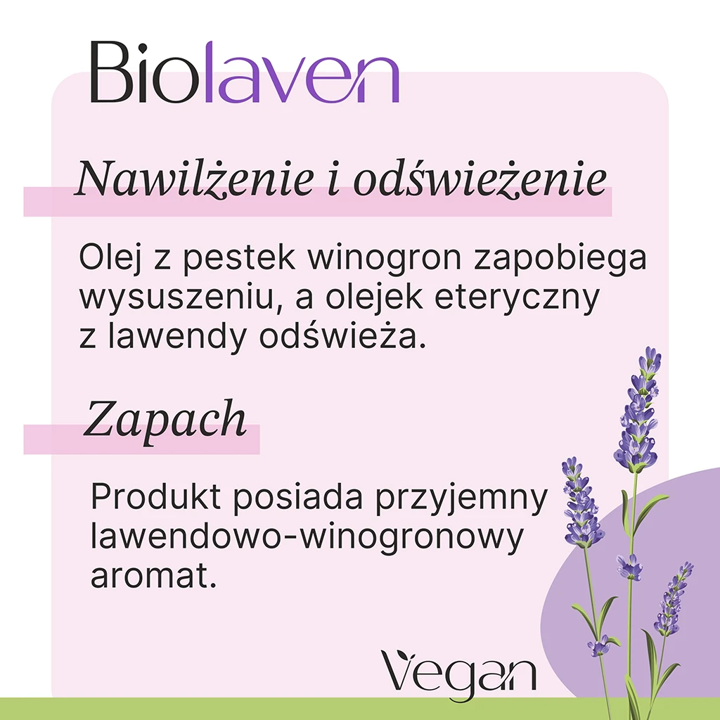 Żel posiada niezwykle lekką formułę, bogatą w naturalne składniki. Przyjemny lawendowo-winogronowy aromat produktu sprawia, że codzienna pielęgnacja staje się przyjemnością i doskonałym momentem odprężenia.