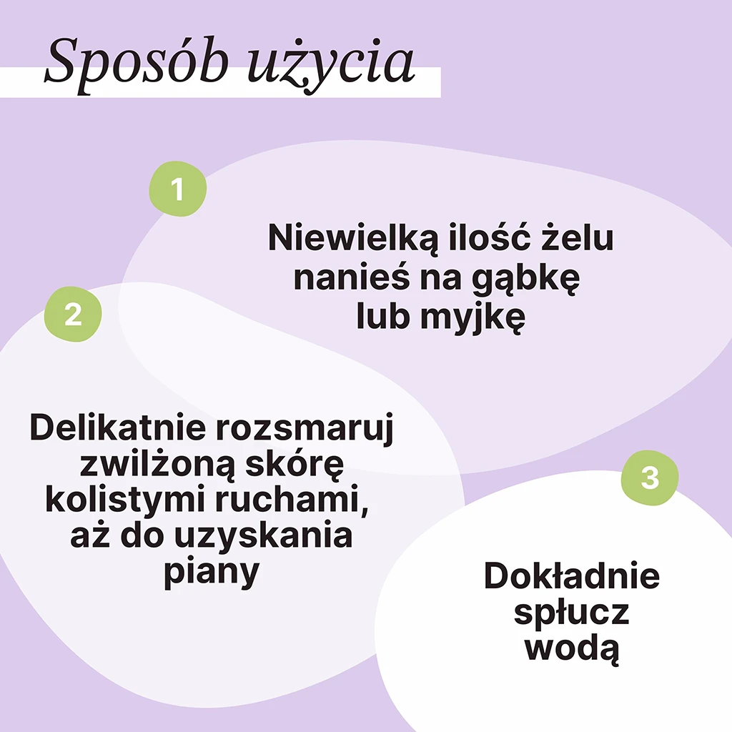 Sposób użycia | Niewielką ilość żelu nanieść na gąbkę lub myjkę, delikatnie rozsmarować zwilżoną skórę kolistymi ruchami, aż do uzyskania piany. Dokładnie spłukać wodą. |