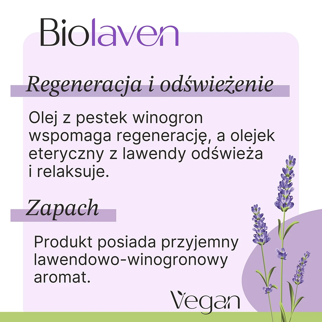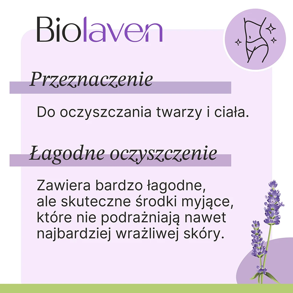 Naturalny żel pod prysznic BIOLAVEN został stworzony z myślą o każdym rodzaju skóry, również tej najbardziej wrażliwej. Świetnie sprawdza się w codziennej higienie ciała i twarzy. Zapewnia łagodne oczyszczanie, regeneruje i odświeża skórę.