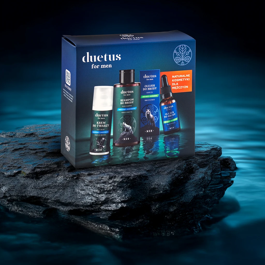 Zestaw Duetus to także świetny pomysł na prezent dla każdego mężczyzny dbającego o swój wygląd. Elegancko dobrane produkty – krem do twarzy, szampon do brody i olejek – tworzą kompletną rutynę pielęgnacyjną, która pozwala na codzienną troskę o skórę i włosy. To praktyczny, stylowy i funkcjonalny prezent, który ucieszy każdego brodacza, niezależnie od długości i typu brody, łącząc troskę o wygląd z przyjemnością codziennego rytuału.