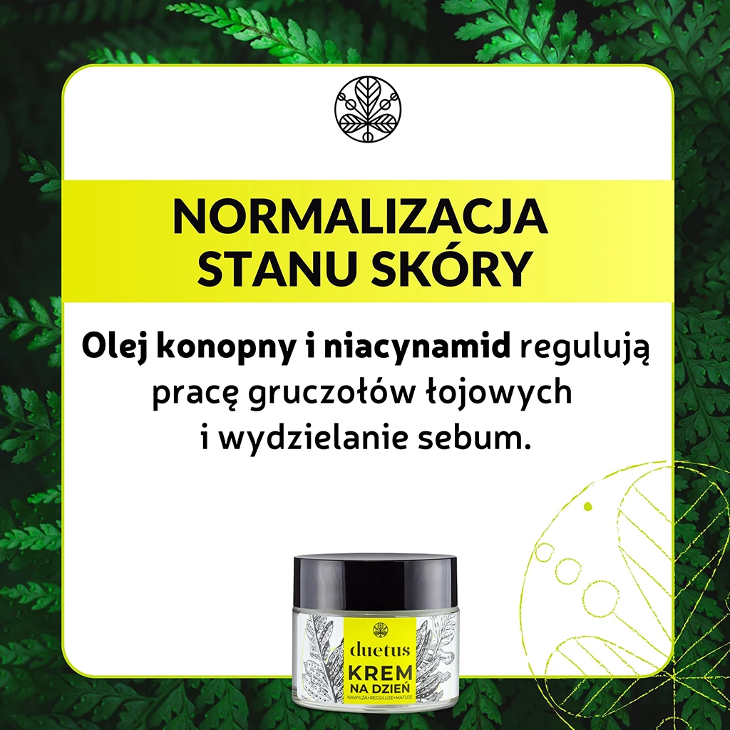 Krem zawiera olej konopny oraz niacynamid, które są znane z regulacji pracy gruczołów łojowych i wydzielania sebum. Te składniki pomagają znormalizować stan skóry, zredukować poziom tłustości i ograniczyć występowanie niedoskonałości. Jest to szczególnie korzystne dla skóry mieszanej i tłustej, której często towarzyszą problemy z nadmiernym wydzielaniem sebum.