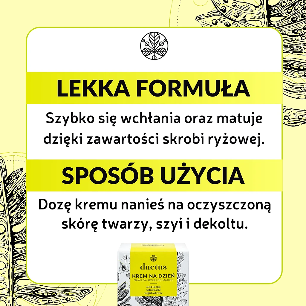 DUETUS Krem na dzień charakteryzuje się lekką formułą, co sprawia, że jest idealnym wyborem dla osób pragnących mieć poczucie komfortu i świeżości na swojej skórze przez cały dzień. Produkt szybko się wchłania, nie pozostawiając uczucia tłustości czy ciężkości na skórze. Ponadto, zawiera skrobię ryżową, która dzięki swoim matującym właściwościom, idealnie sprawdzi się dla osób z cerą tłustą czy mieszana.