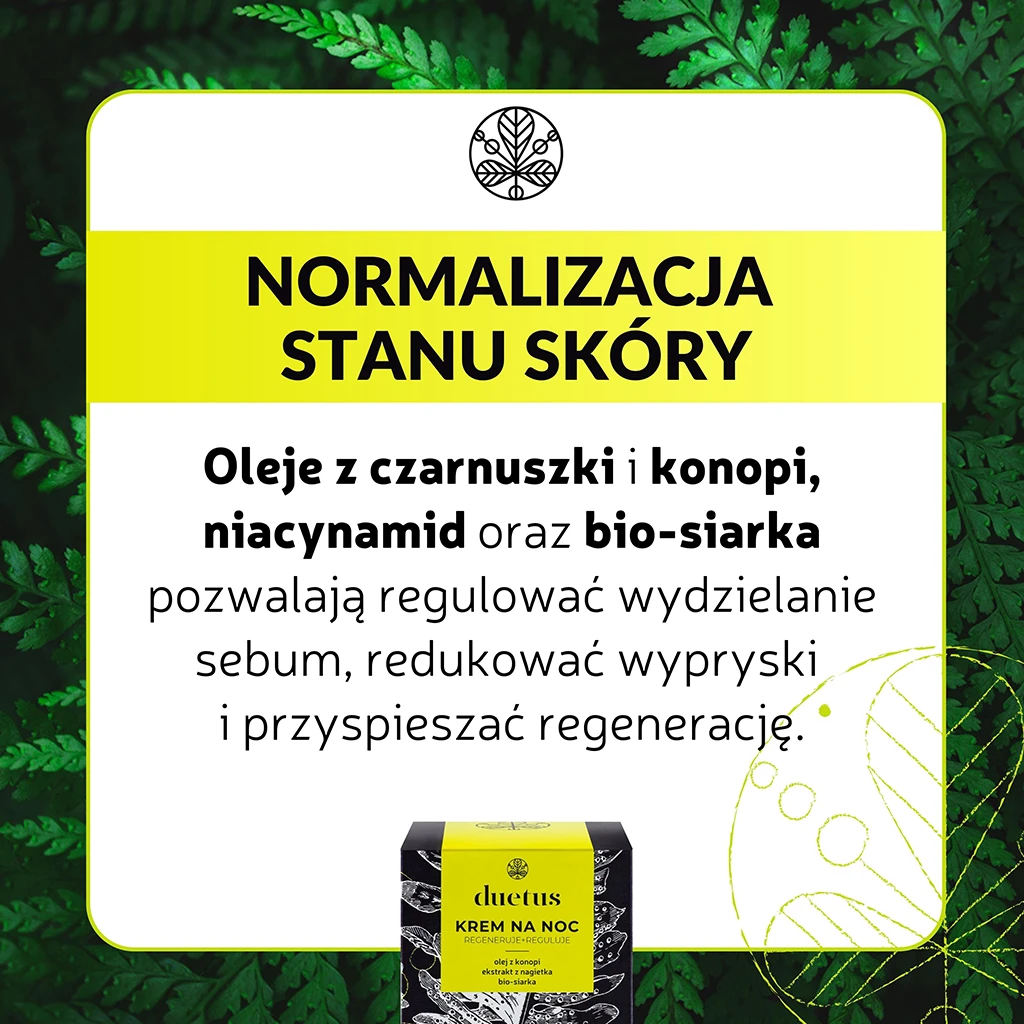 Dzięki zawartości olejów z czarnuszki i konopi, niacynamidu oraz bio-siarki, produkt skutecznie pomaga normalizować stan skóry. Oleje te są znane z właściwości regulujących wydzielanie sebum, co jest szczególnie ważne dla osób z tłustą i mieszana cerą. Niacynamid i bio-siarka pomagają w redukcji wyprysków, wspomagają proces regeneracji skóry, pozostawiając ją zdrowszą i bardziej promienną.