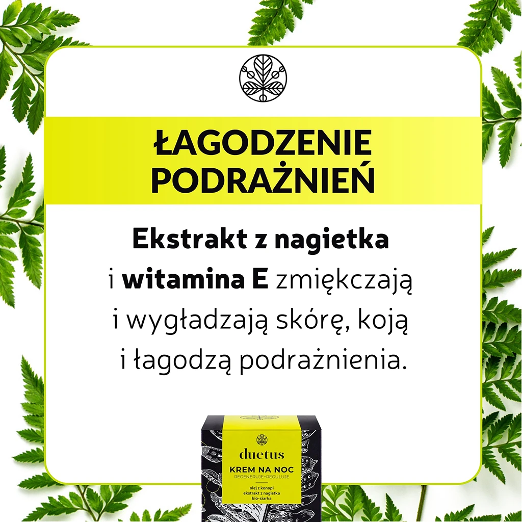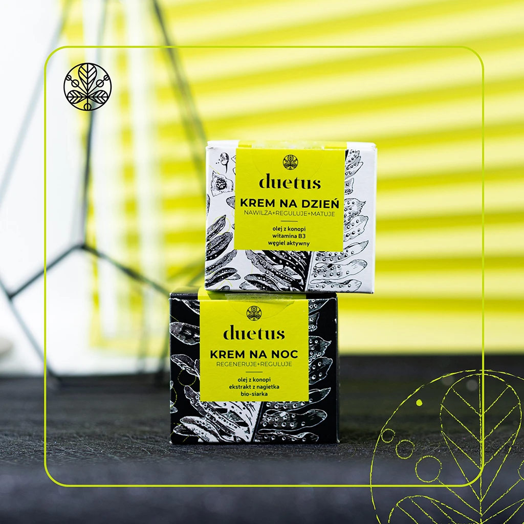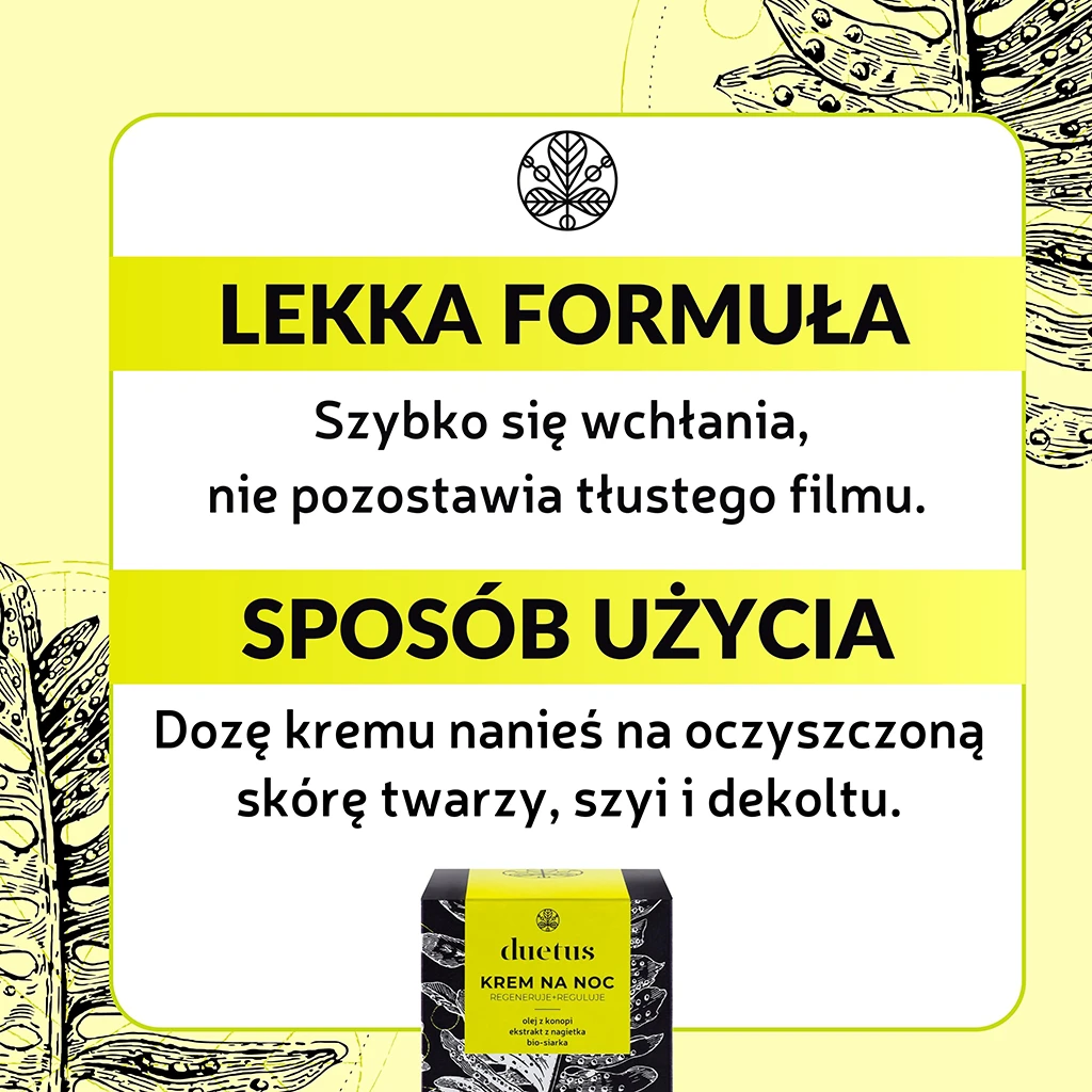 DUETUS Krem na noc to lekki krem, który idealnie sprawdzi się w wieczornej pielęgnacji skóry. Jego zaletą jest szybkie wchłanianie, dzięki czemu nie pozostawia tłustego filmu na skórze. Krem ten został stworzony z myślą o zapewnieniu Twojej skórze odżywienia i regeneracji zachodzącej nocą.