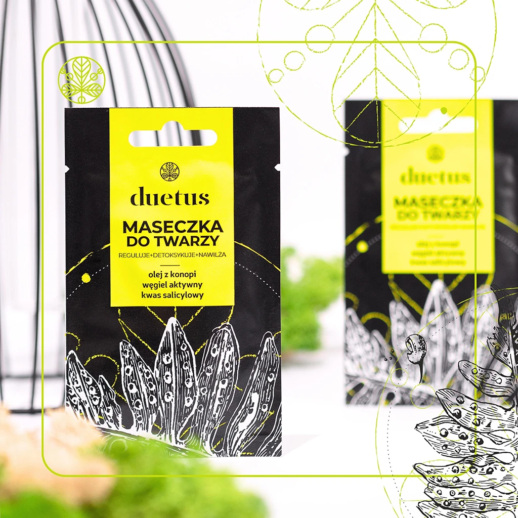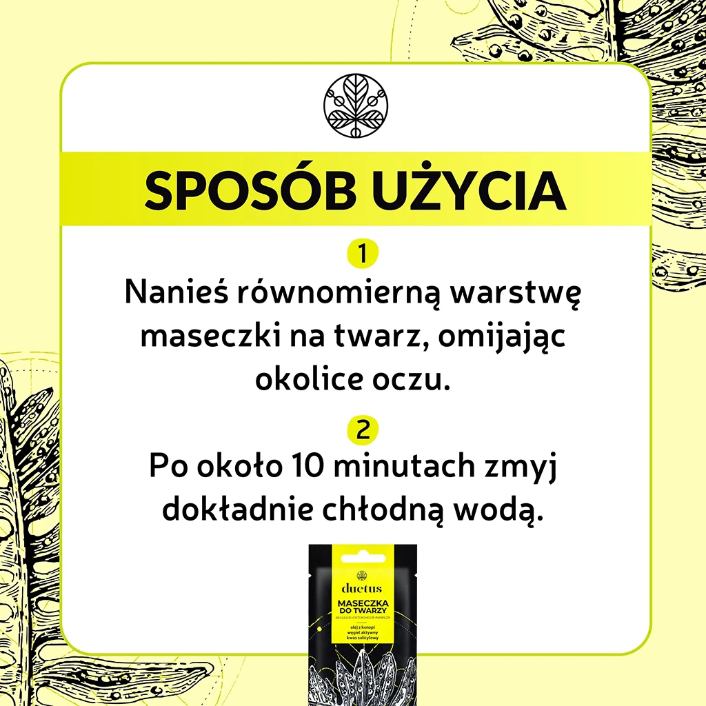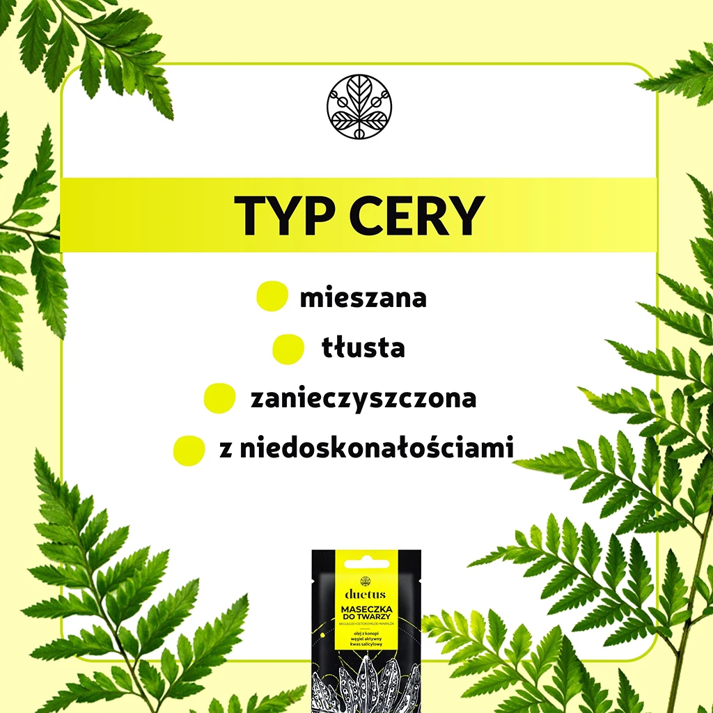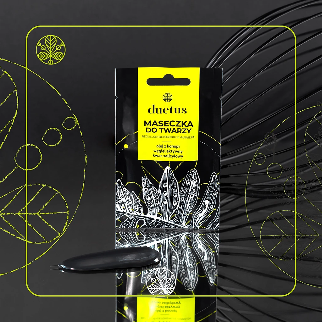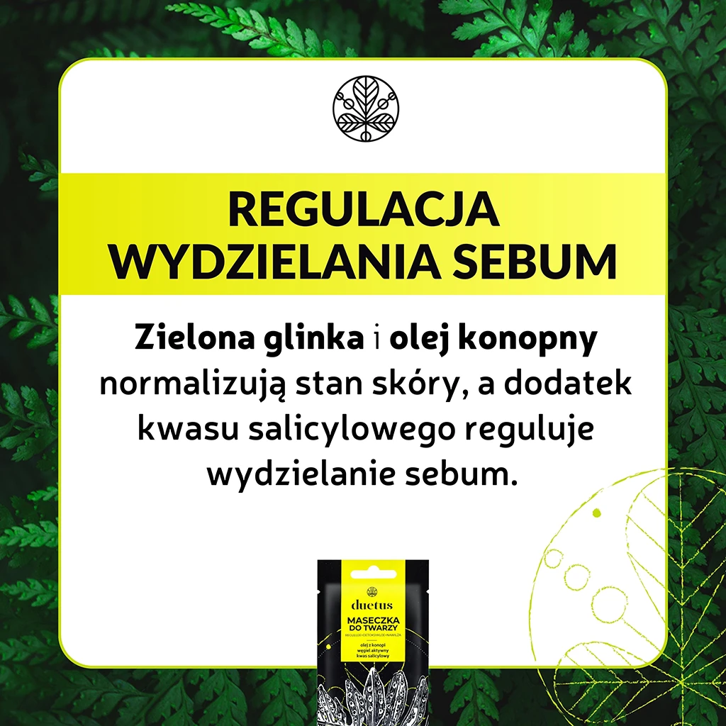Maseczka do twarzy przeznaczona do zaawansowanej pielęgnacji cery mieszanej lub z niedoskonałościami. Glinka zielona i olej z konopi oczyszczają i zmniejszają pory, regulując proces wydzielania sebum. Zawarty w maseczce węgiel aktywny posiada zdolność przyciągania oraz pochłaniania toksyn i różnego rodzaju zanieczyszczeń. Kwas salicylowy dogłębnie oczyszcza i rozjaśnia powierzchowne przebarwienia. Ekstrakt z lukrecji gładkiej, sorbitol oraz olej z pestek winogron odpowiadają jednocześnie za utrzymanie odpowiedniego poziomu nawilżenia. Po zastosowaniu maseczki skóra staje się widocznie wygładzona, odświeżona i zmatowiona.