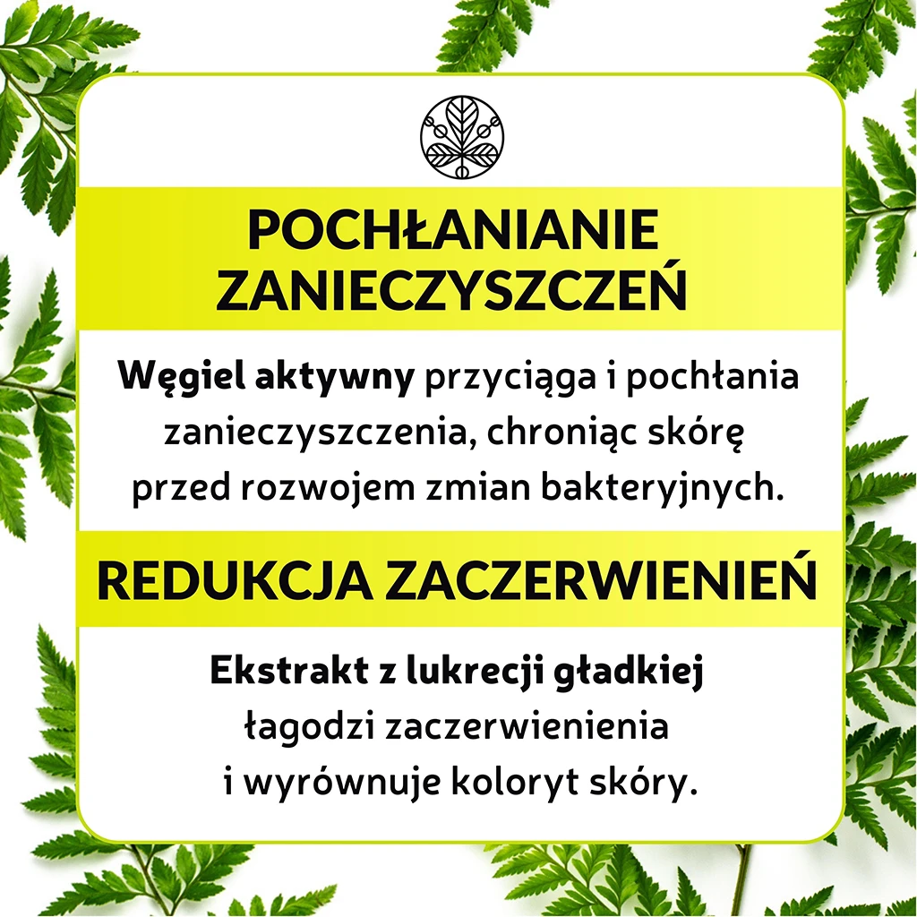Działanie | Pochłania zanieczyszczenia, Redukuje zaczerwienienia, Reguluje wydzielane sebum |