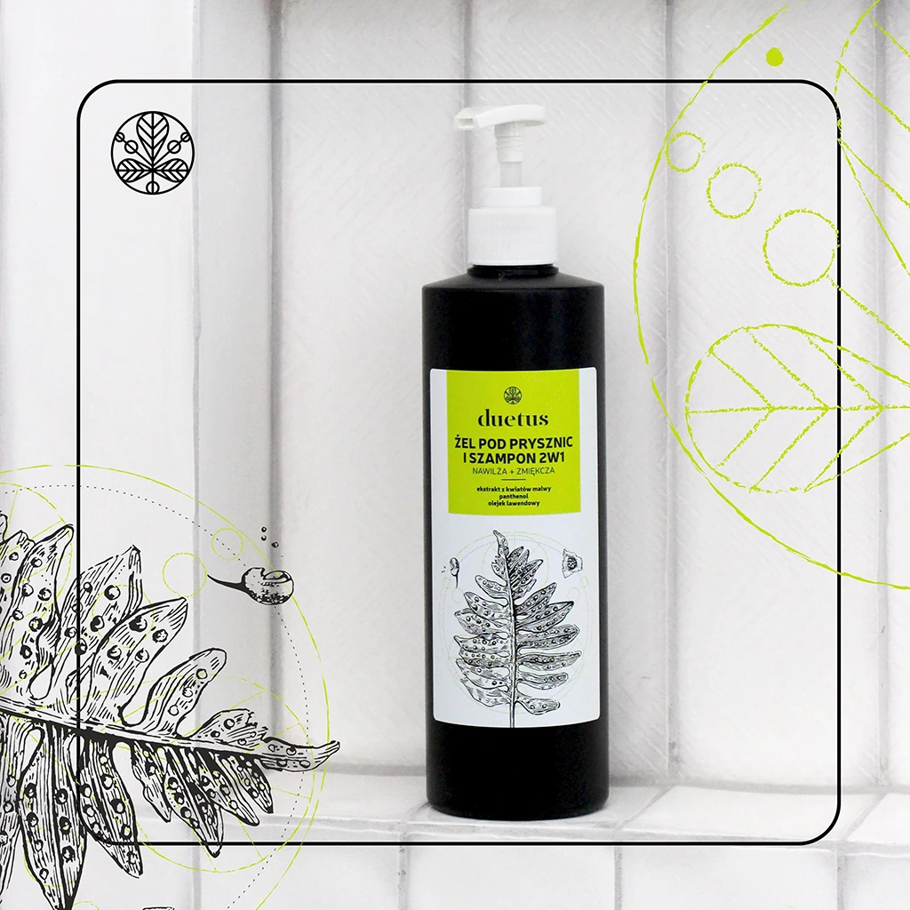 DUETUS Żel pod prysznic i szampon 2w1 to wielozadaniowy produkt, który doskonale sprawdzi się podczas oczyszczania twarzy, ciała oraz włosów. Dzięki temu wszechstronnemu rozwiązaniu, oszczędzisz czas i miejsce w łazience, ciesząc się kompleksową pielęgnacją za pomocą jednego produktu. Pozwól kosmetykowi zadbać o Twoje potrzeby i zadbaj o swoją skórę i włosy w prosty, praktyczny sposób.
