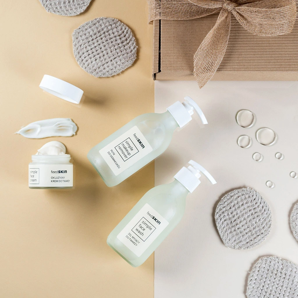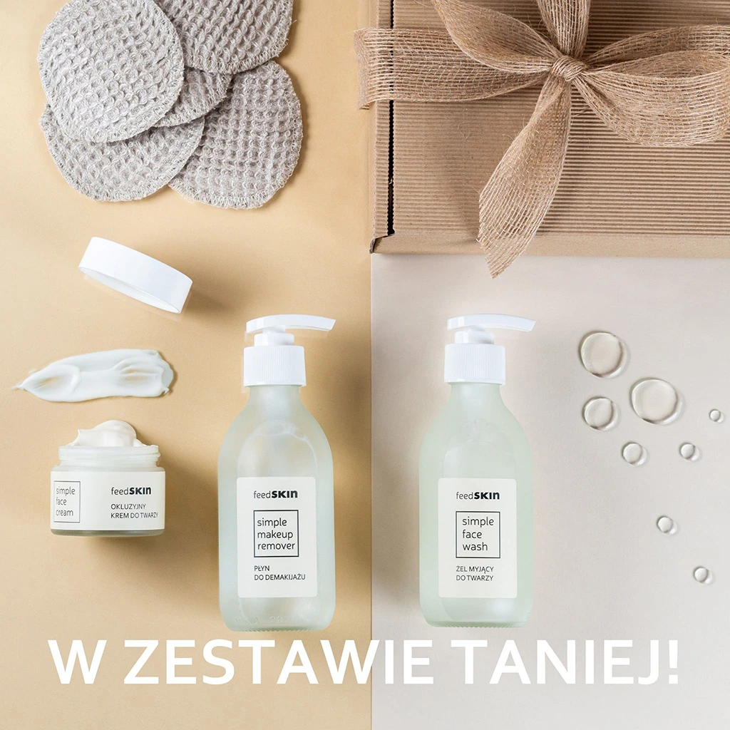Zestaw FEEDSKIN Simple to komplet kosmetyków, który został zaprojektowany z myślą o wszystkich rodzajach skóry i jest odpowiedni zarówno dla osób z suchą, normalną, mieszaną, jak i tłustą skórą. Składa się z 3 kosmetyków takich jak krem do twarzy, żel myjący i płyn micelarny, które zostały specjalnie dobrane, aby jak najlepiej działać i uzyskać jak najlepsze efekty. Oprócz tego w zestawie znajduje się również Zestaw do demakijażu Less Waste - czyli w 100% ekologiczne płatki do demakijażu do wielokrotnego stosowania. Świetnie sprawdzą się podczas usuwania makijażu oczu, twarzy czy ust. Wykonane z naturalnego, ekologicznego materiału (len) płatki delikatnie masują i ujędrniają skórę.