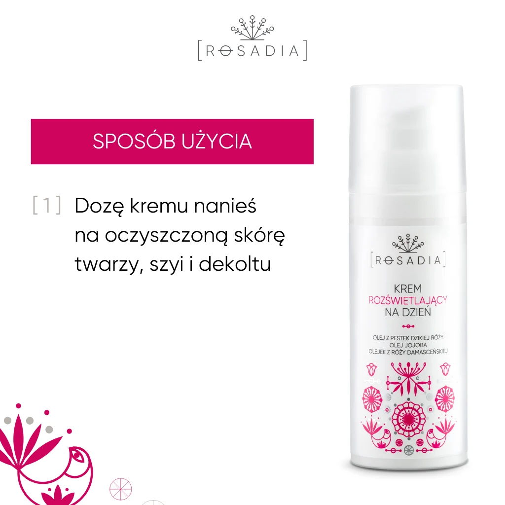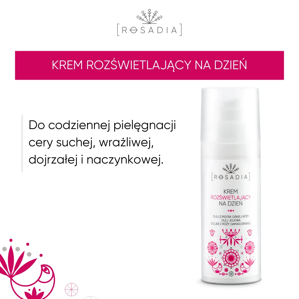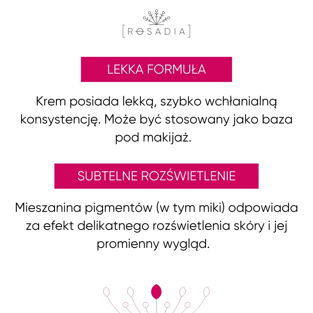 Krem rozświetlający na dzień to bardzo fajny produkt z serii Rosadia, doskonale nawilża skórę, łatwo się wchłania. Dla mnie bardzo dobry krem pod makijaż, efekt rozświetlenia, nadaje cerze zdrowy wygląd. Bardzo wygodne opakowanie z pompką,estetyczny i ciekawy wygląd, polecam.
