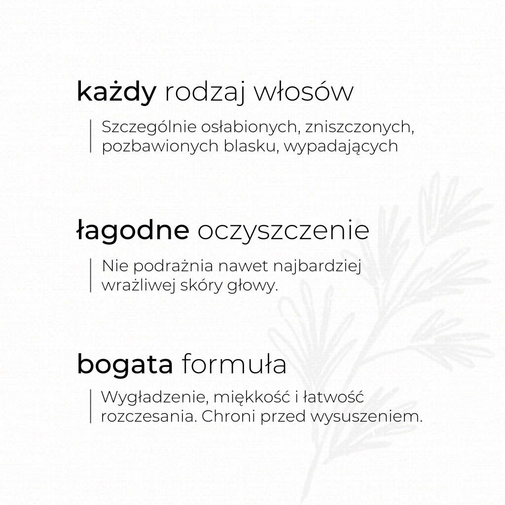 Naturalny, przeznaczony do pielęgnacji każdego rodzaju włosów, szczególnie słabych, zniszczonych, pozbawionych blasku, z tendencją do wypadania. Zawiera bardzo łagodne, ale jednocześnie skuteczne środki myjące, które nie podrażniają nawet najbardziej wrażliwej skóry głowy. Unikalne połączenie oleju jojoba i masła karite z naturalnymi składnikami nawilżającymi zapewnia włosom ochronę przed wysuszeniem i niekorzystnymi warunkami atmosferycznymi. Przy regularnym stosowaniu normalizuje stan skóry głowy, a włosom nadaje miękkość, gładkość i lekkość bez efektu puszenia.