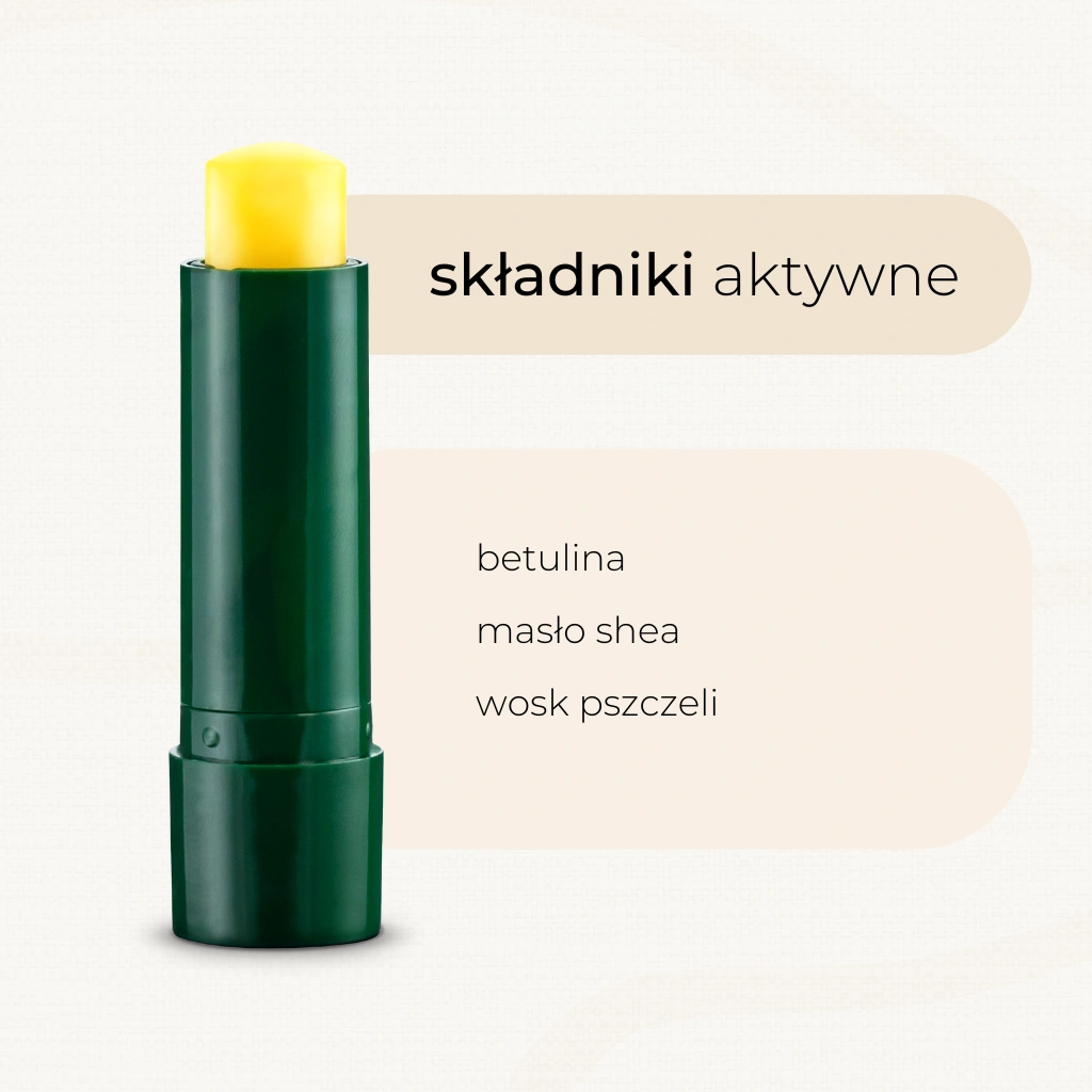 Brzozowa pomadka ochronna z betuliną zawiera tylko naturalne składniki. Masło Shea (karite) i masło kakaowe wygładzają i uelastyczniają usta, natomiast olej sojowy, jojoba i wiesiołkowy nawilżają je oraz zapobiegają ich wysychaniu i pękaniu. Pomadka stanowi doskonałą barierę ochronną przed mrozem, wiatrem i promieniami słonecznymi. Aktywny składnik - betulina - działa kojąco i regenerująco na wszelkie podrażnienia.