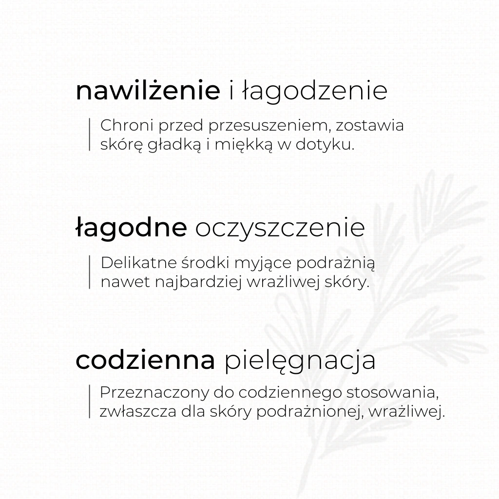 Działanie | Łagodnie oczyszcza, Łagodzi podrażnienia, Nawilża |