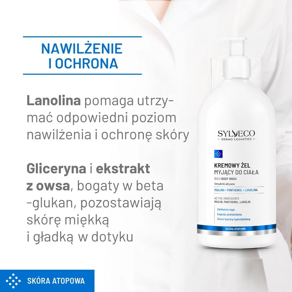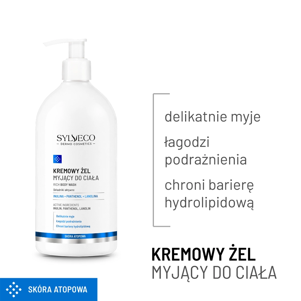 SYLVECO Dermo Kremowy żel myjący do ciała w nowej, dużej pojemności 1L to wyjątkowo łagodny kosmetyk stworzony z myślą o codziennej pielęgnacji skóry wymagającej – suchej, wrażliwej, atopowej oraz skłonnej do podrażnień. Jego kremowa, emolientowa formuła skutecznie oczyszcza, jednocześnie zapobiegając utracie wilgoci i wspierając naturalną barierę ochronną naskórka. Dzięki starannie dobranym składnikom myjącym produkt nie szczypie, nie wysusza i nie pozostawia uczucia ściągnięcia.