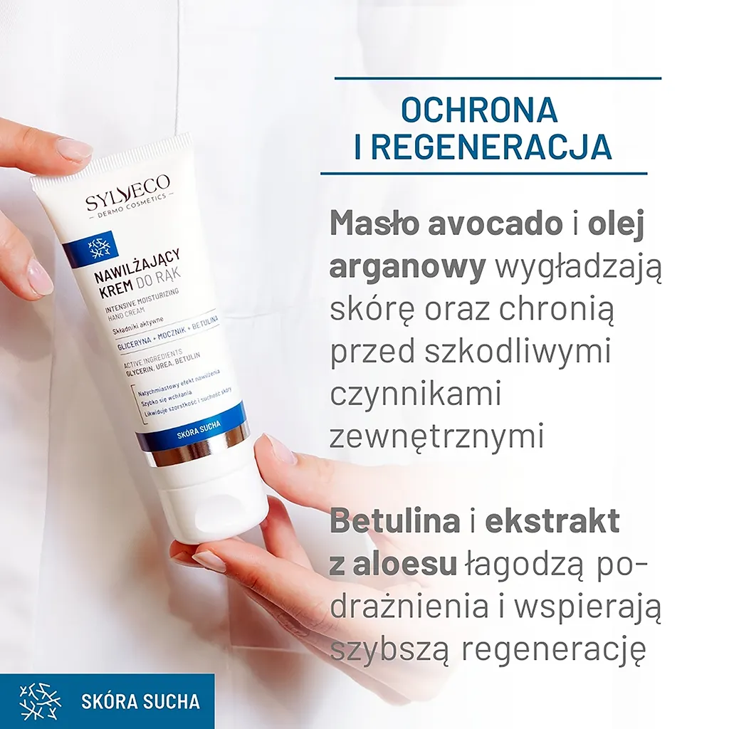 Krem do rąk z niebieskiej linii SYLVECO DERMO został stworzony dla osób mających skórę suchą, odwodnioną, wrażliwą, delikatną, z zaburzoną barierą hydrolipidową. Za silne, długotrwałe nawilżenie i zmiękczenie skóry odpowiada mocznik, który wiąże wodę w skórze.