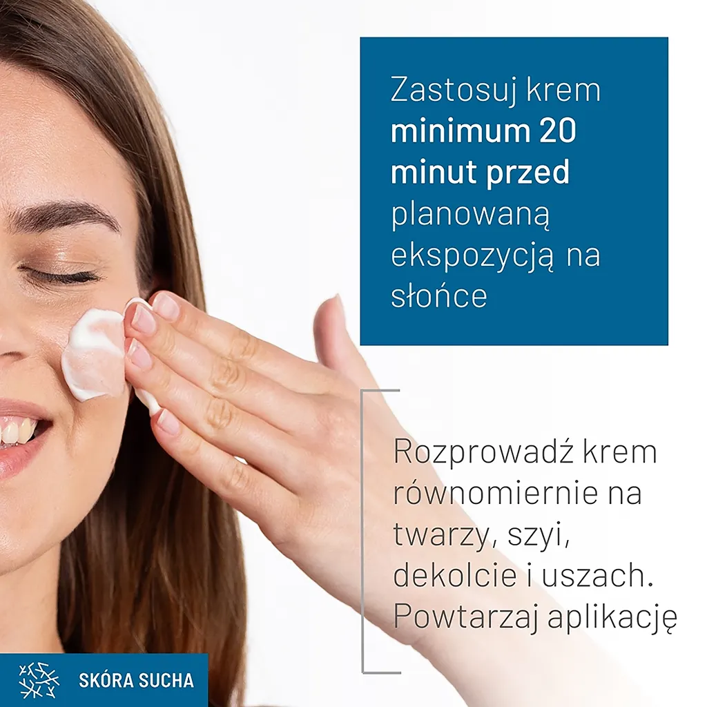 Sposób użycia | Zastosuj krem minimum 20 minut przed planowaną ekspozycją na słońce. Rozprowadź krem równomiernie na twarzy, szyi, dekolcie i uszach. Powtarzaj aplikację, aby zachować pełną ochronę przeciwsłoneczną. |