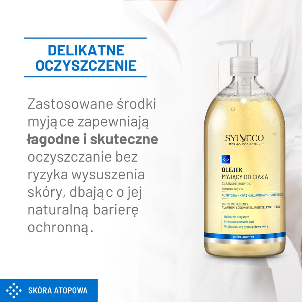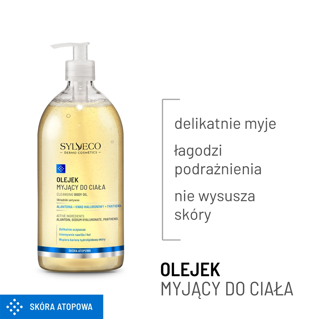 SYLVECO DERMO Skóra atopowa Olejek myjący do ciała to wyjątkowo łagodny preparat do codziennego oczyszczania skóry wymagającej – atopowej, suchej, delikatnej i wrażliwej. Został opracowany tak, aby już podczas mycia przynosić ukojenie, odbudowywać komfort i chronić funkcję bariery hydrolipidowej. Formuła bogata w alantoinę, kwas hialuronowy oraz panthenol działa intensywnie nawilżająco i łagodząco, minimalizując zaczerwienienie, swędzenie i uczucie napięcia. Dodatek odżywczych olejów – ze słodkich migdałów, z kiełków pszenicy i oleju konopnego – wspiera regenerację naskórka, redukuje jego suchość i zabezpiecza przed utratą wilgoci.