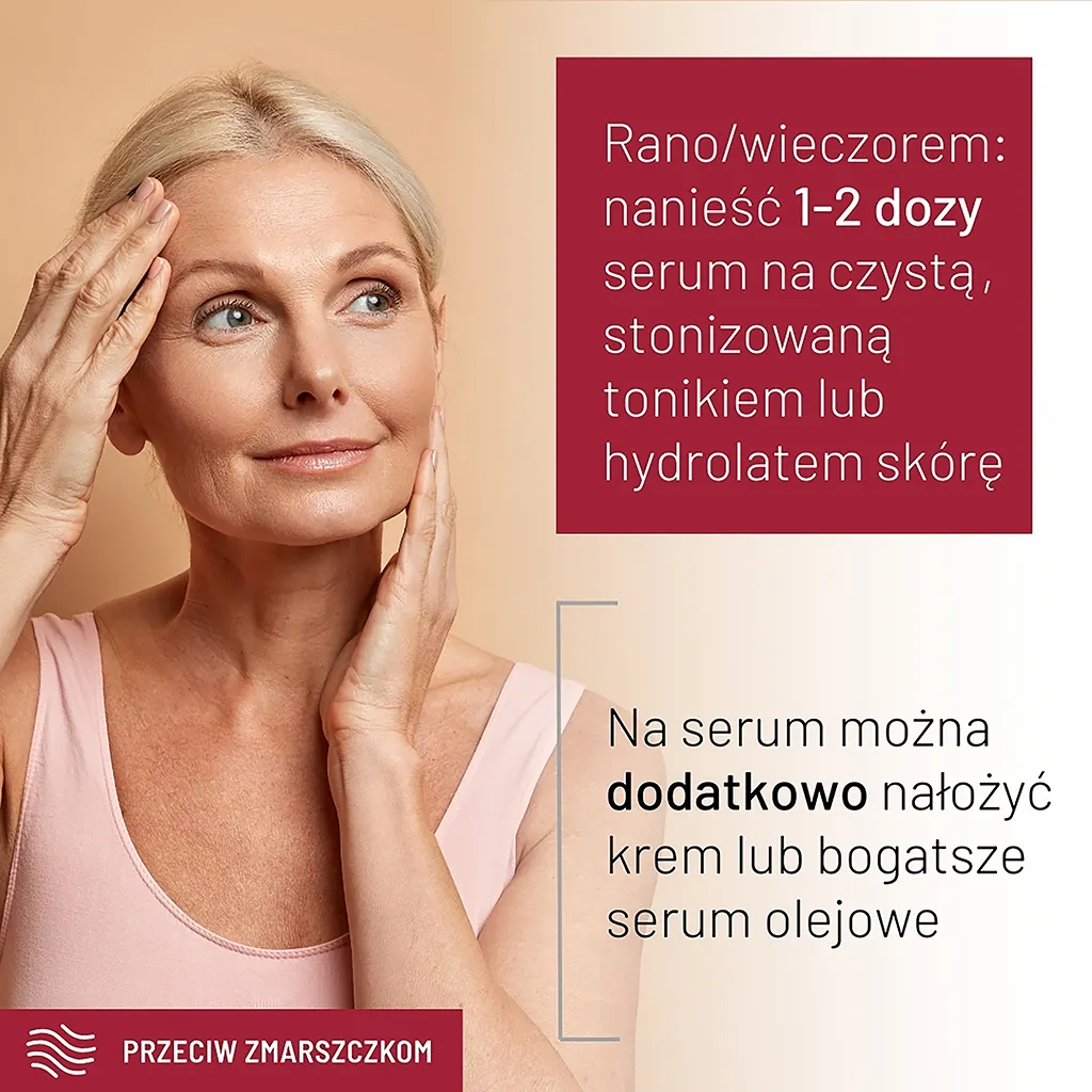 Rozświetlające serum do twarzy przeznaczone do intensywnej pielęgnacji cery z widocznymi efektami starzenia, zmarszczkami mimicznymi, utratą jędrności i gęstości skóry. Jest idealnym uzupełnieniem pielęgnacji cery dojrzałej z widoczną utratą jędrności i elastyczności.