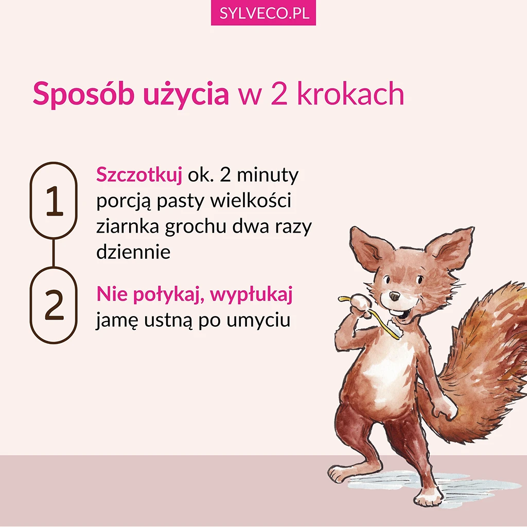 Sposób użycia | Szczotkować ok. 2 minuty porcją pasty wielkości ziarnka grochu dwa razy dziennie. Nie połykać, po umyciu wypłukać jamę ustną. Stosować pod opieką dorosłego. |