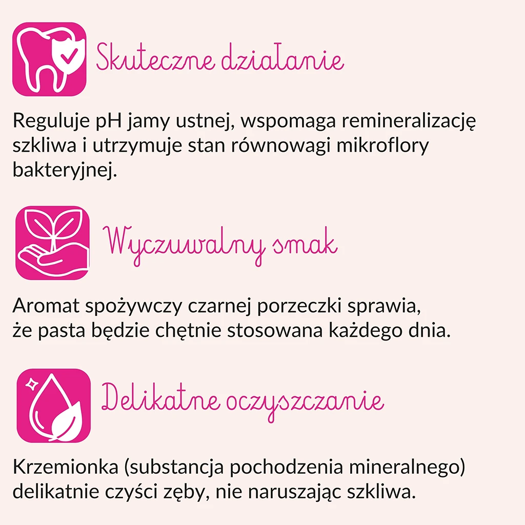Naturalna pasta bez fluoru do codziennego stosowania. Dodatek ksylitolu wspomaga ochronę przed próchnicą, reguluje pH jamy ustnej i utrzymuje stan równowagi jej mikroflory bakteryjnej. Uwodniona krzemionka o niskim współczynniku ścieralności delikatnie czyści, nie naruszając szkliwa i chroni dziąsła przed podrażnieniami. Słodki smak, który zapewniają naturalne składniki (sorbitol gliceryna) i aromat czarnej porzeczki zachęcają co codziennego stosowania.
