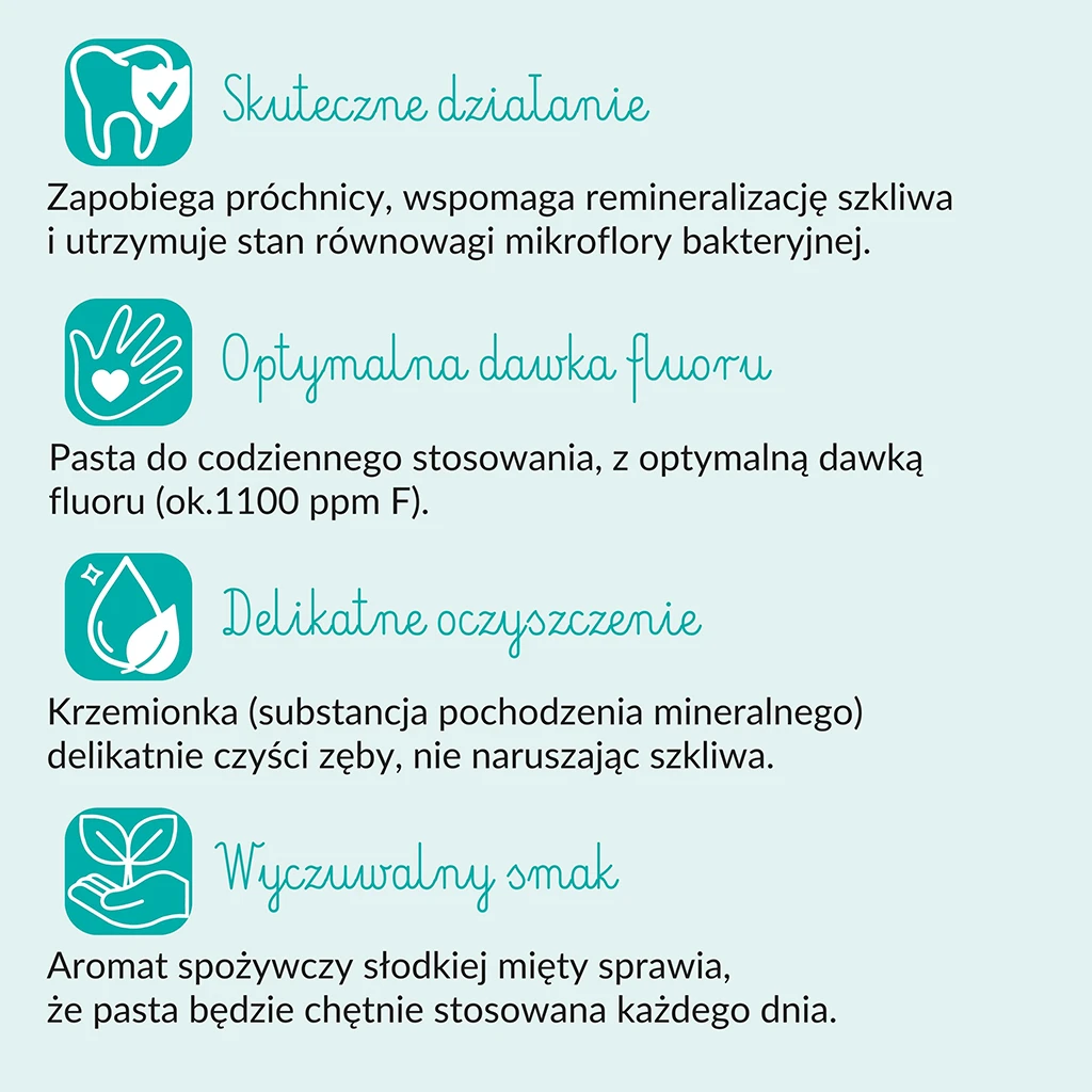 Naturalna pasta do codziennego stosowania, z optymalną dawką fluoru (ok. 1100 ppm F), zapobiega próchnicy i wspomaga remineralizację. Dodatek ksylitolu reguluje pH jamy ustnej i utrzymuje stan równowagi jej mikroflory bakteryjnej. Uwodniona krzemionka o niskim współczynniku ścieralności delikatnie czyści zęby, nie naruszając szkliwa i chroni dziąsła przed podrażnieniami. Słodkie składniki (sorbitol gliceryna) i łagodny smak mięty sprawią, że pasta będzie chętnie stosowana każdego dnia.