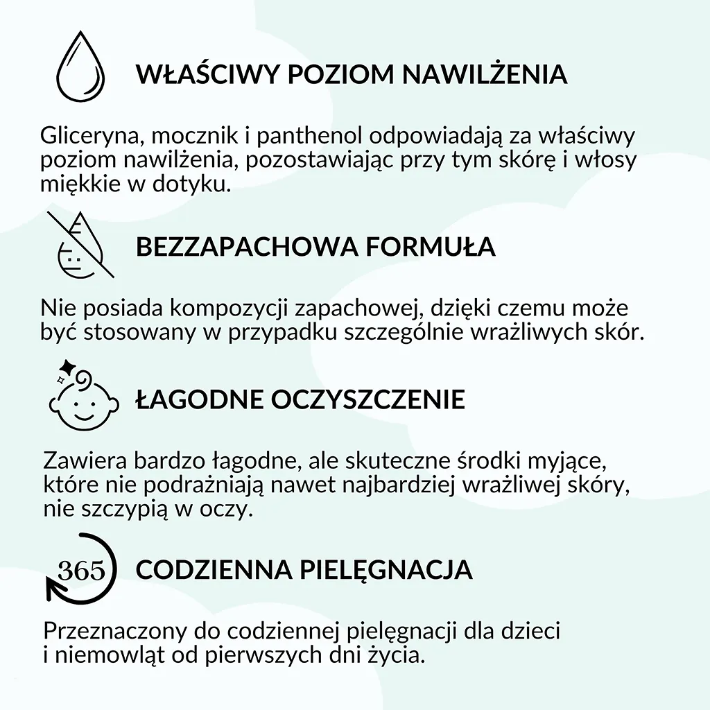 Głównym celem jest zapewnienie optymalnego oczyszczenia, a jednocześnie zachowanie naturalnej bariery ochronnej skóry dziecka. Zawiera bardzo łagodne, ale skuteczne środki myjące. Produkt jest na tyle delikatny, że nie szczypie w oczy, co jest niezwykle ważne podczas kąpieli najmłodszych.