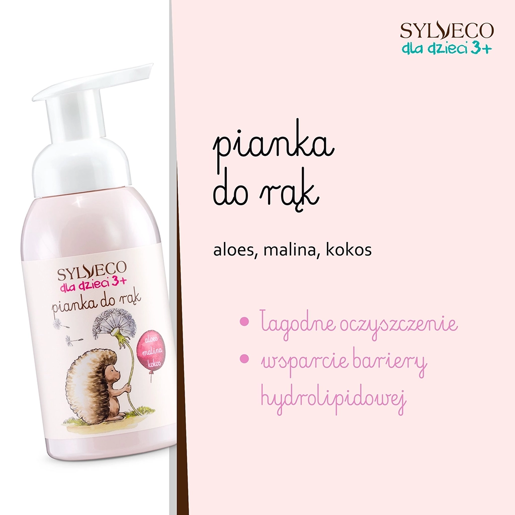SYLVECO dla dzieci 3+ pianka do mycia rąk - różowa - puszysta i pachnąca pianka sprawi, że mycie rączek stanie się przyjemną, codzienną rutyną. Skutecznie oczyszcza, nie podrażniając, a naturalne składniki (olej kokosowy, ekstrakty z aloesu i owoców malin, gliceryna oraz mocznik) utrzymują nawilżenie skóry.
