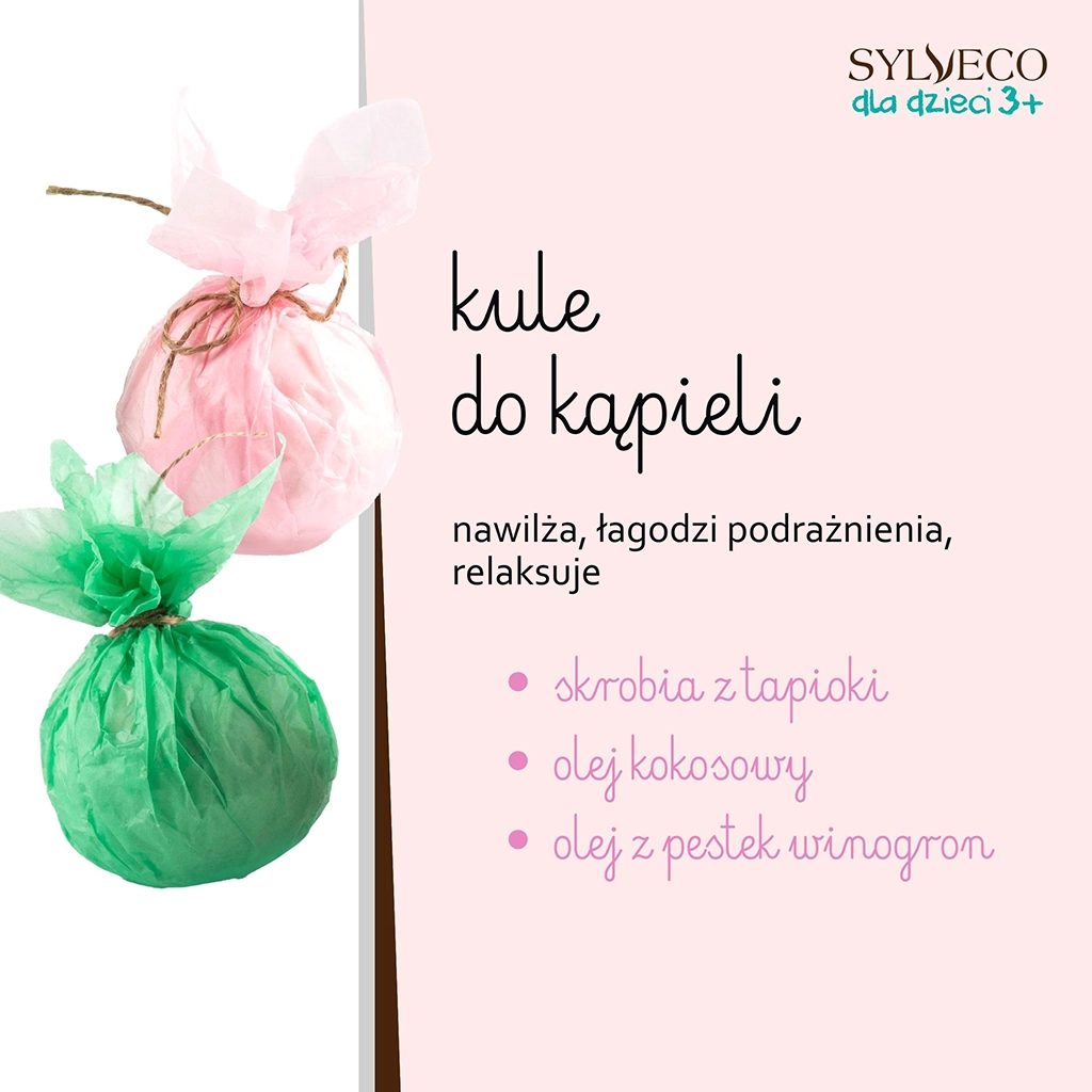 2x SYLVECO dla dzieci 3+ kula kąpielowa - pachnąca, kolorowa musująca kula zawierająca naturalne spożywcze barwniki umili wieczorne zabawy w wannie. Kula wzbogacona jest olejem kokosowym i olejem z pestek winogron, zmiękczają i pozostawiają skórę nawilżoną.