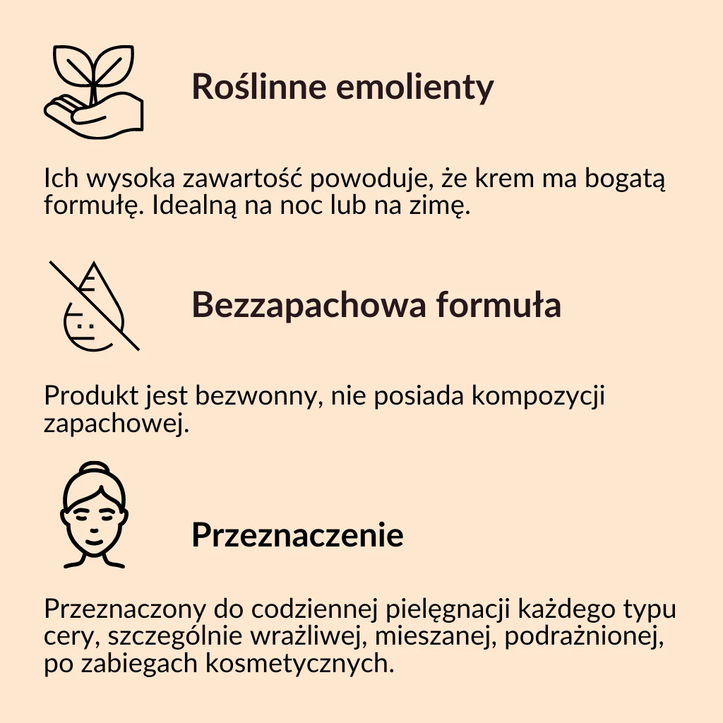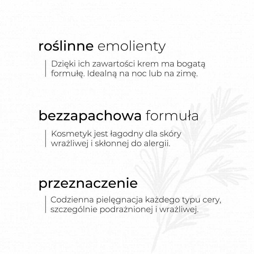Przeznaczony do codziennej pielęgnacji każdego typu cery, szczególnie wrażliwej, mieszanej, podrażnionej i po zabiegach kosmetycznych. Krem zawiera unikalne połączenie roślinnych emolientów, które sprawiają, że jego formuła jest niezwykle bogata. To idealny krem na noc i na zimowe miesiące.