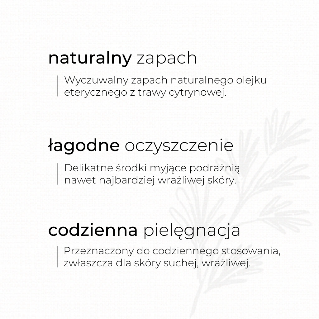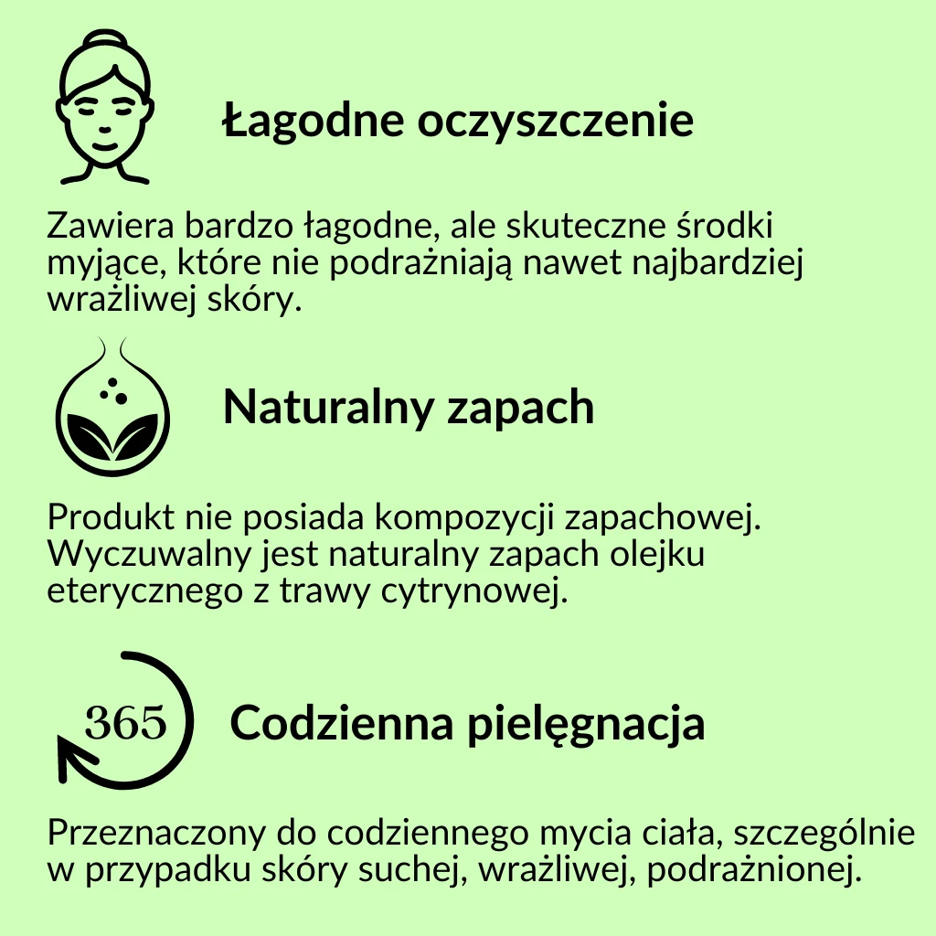 Naturalny, kremowy żel do mycia ciała z cytrusową nutą zapachową, pochodzącą od naturalnego olejku eterycznego z werbeny egzotycznej. Zawiera bardzo łagodne, ale jednocześnie skuteczne środki myjące, które nie podrażniają nawet najbardziej wrażliwej skóry. Żel posiada fizjologiczne pH, łatwo tworzy pianę, dokładnie oczyszczając skórę i ją odświeżając. W składzie znalazły się składniki o działaniu zmiękczającym i odbudowującym barierę lipidową, a ekstrakt z liści ruty zwyczajnej poprawia kondycję skóry skłonnej do zaczerwienienia. Codzienne stosowanie żelu pod prysznicem, czy w czasie kąpieli, wspomaga regenerację przesuszonej skóry, pozostawiając ją elastyczną i gładką.