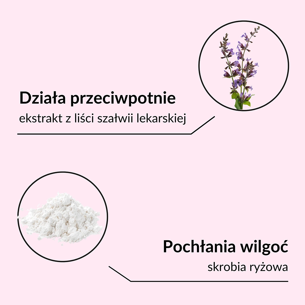 Dezodorant bez soli aluminium i alkoholu, zawierający skuteczne składniki absorbujące pot, niwelujące jednocześnie nieprzyjemny zapach. Ekstrakt z liści szałwii lekarskiej o właściwościach ściągających oraz kombinacja naturalnych olejków eterycznych o kwiatowym aromacie pozwala czuć się świeżo i komfortowo przez dłuższy czas.