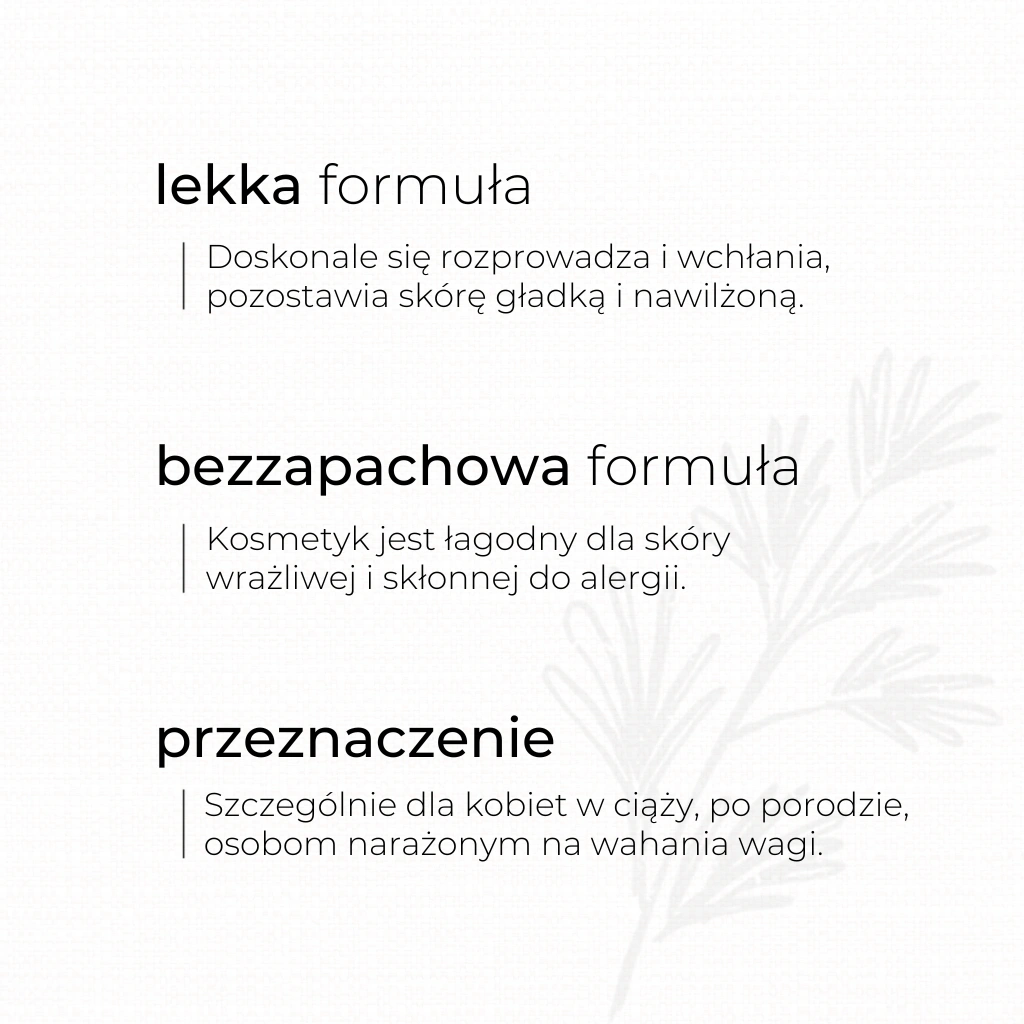 Wskazania: Balsam polecany jest szczególnie kobietom w ciąży, po porodzie i matkom karmiącym, a także osobom, narażonym na wahania wagi.