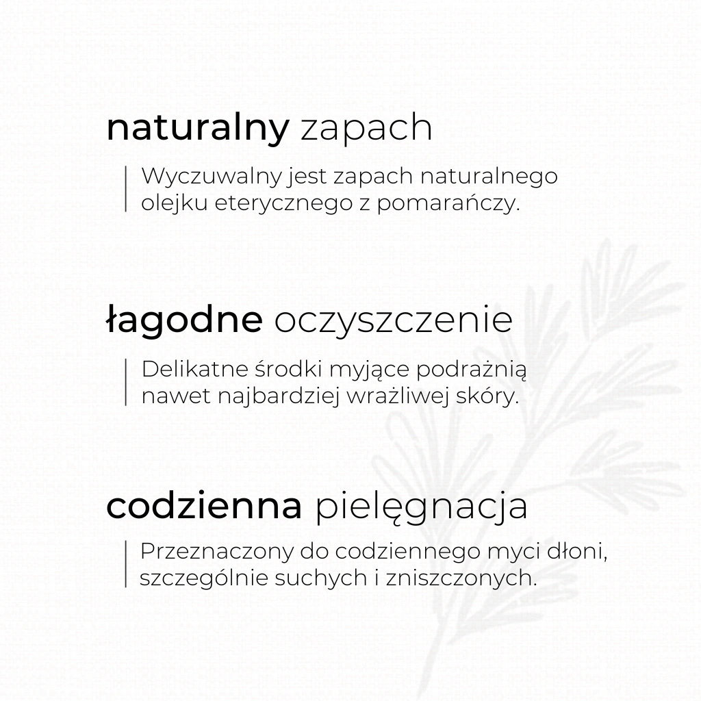 Naturalny, delikatny żel myjący, do codziennej pielęgnacji rąk. Zawiera bardzo łagodne substancje myjące, które skutecznie oczyszczają i nie podrażniają nawet najbardziej wrażliwej skóry. Ekstrakt z liści podbiału pospolitego posiada właściwości nawilżające i ochronne, przyspiesza regenerację skóry i łagodzi zaczerwienienia. Gliceryna, panthenol i mocznik przywracają skórze miękkość, gładkość i zapobiegają wysuszeniu. Dodatek naturalnego olejku pomarańczowego tonizuje i pozostawia na dłoniach uczucie pachnącej świeżości.