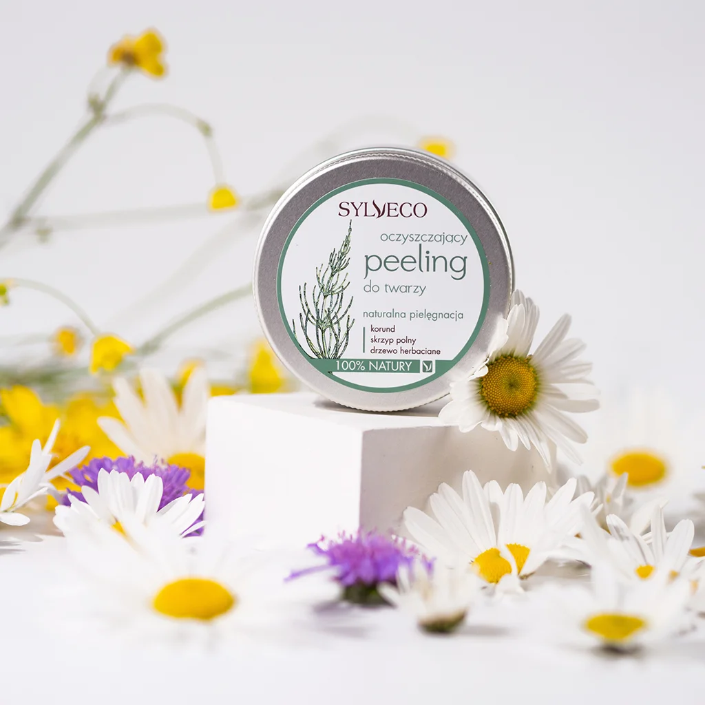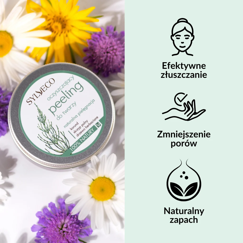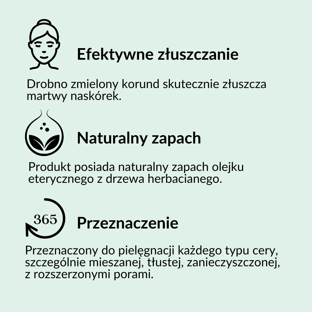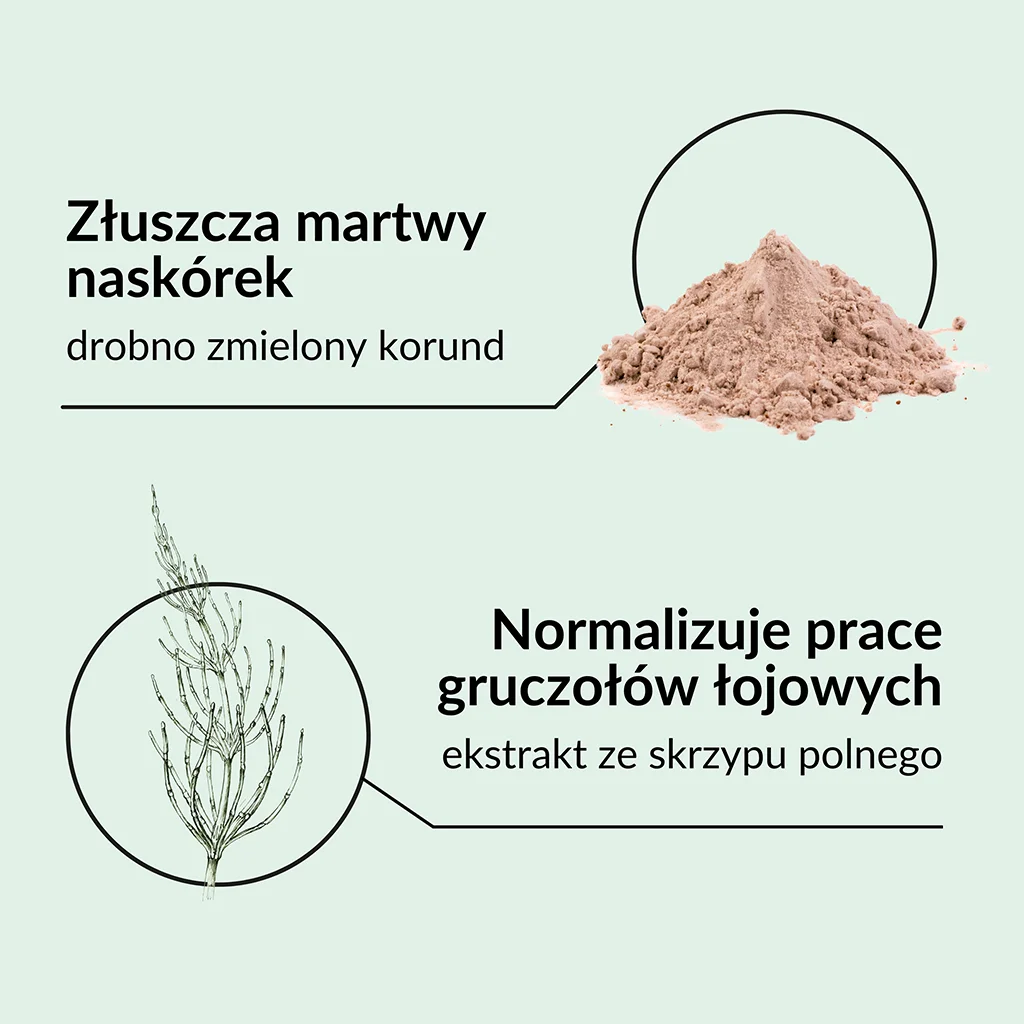 Naturalny, kremowy peeling z korundem przeznaczony do oczyszczania skóry ze skłonnością do przetłuszczania, z rozszerzonymi porami. Drobinki ścierające są mocne i doskonale złuszczają martwy naskórek. Peeling zawiera ekstrakt ze skrzypu polnego o działaniu normalizującym pracę gruczołów łojowych, łagodzącym podrażnienia i przyspieszającym regenerację. Stosowany systematycznie dotlenia skórę, poprawia jej ogólny stan, zmniejsza pory i reguluje wydzielanie sebum.