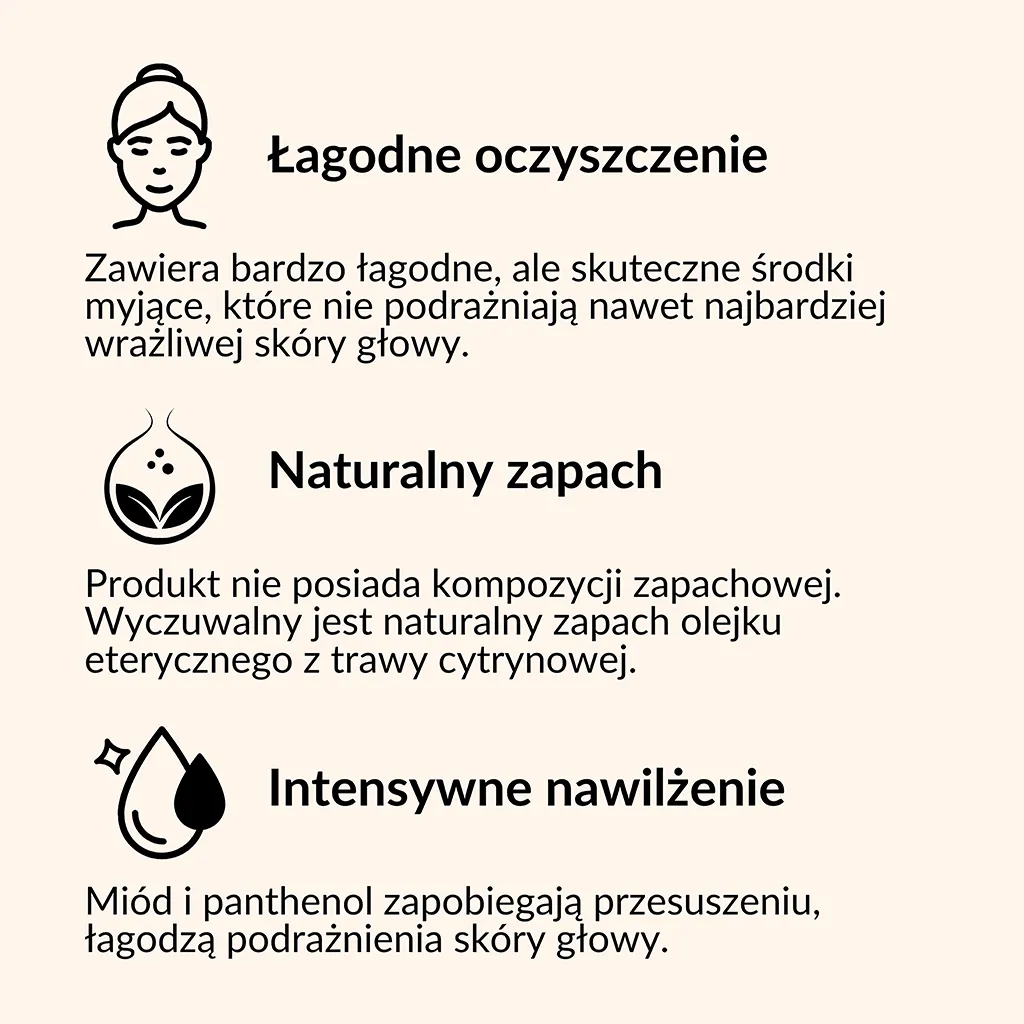 Naturalny szampon zawiera wyjątkowo łagodne, ale skuteczne środki myjące, które delikatnie oczyszczają skórę głowy, nie powodując podrażnień nawet najbardziej wrażliwej skóry. Szampon został wzbogacony o miód i panthenol, które skutecznie zapobiegają przesuszeniu i łagodzą podrażnienia skóry głowy.