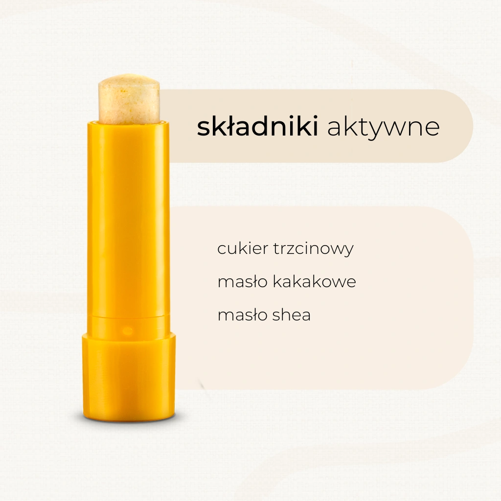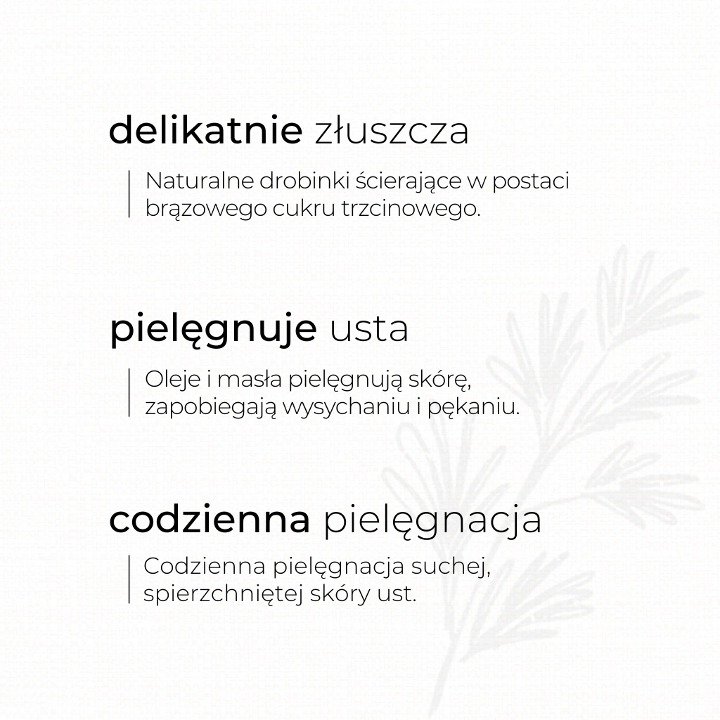 Naturalna, odżywcza pomadka, zawierająca naturalne drobinki ścierające w postaci brązowego cukru trzcinowego. Taki peeling delikatnie złuszcza i doskonale wygładza usta. W składzie pomadki znajduje się bogaty w przeciwutleniacze i kwasy NNKT olej z wiesiołka o właściwościach silnie regenerujących. Pozostałe oleje, wosk pszczeli i masła roślinne pielęgnują delikatny naskórek ust, zapobiegają ich wysychaniu i pękaniu. Aktywny składnik – betulina – działa kojąco na wszelkie podrażnienia.