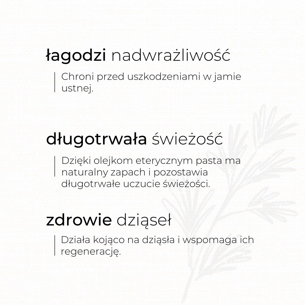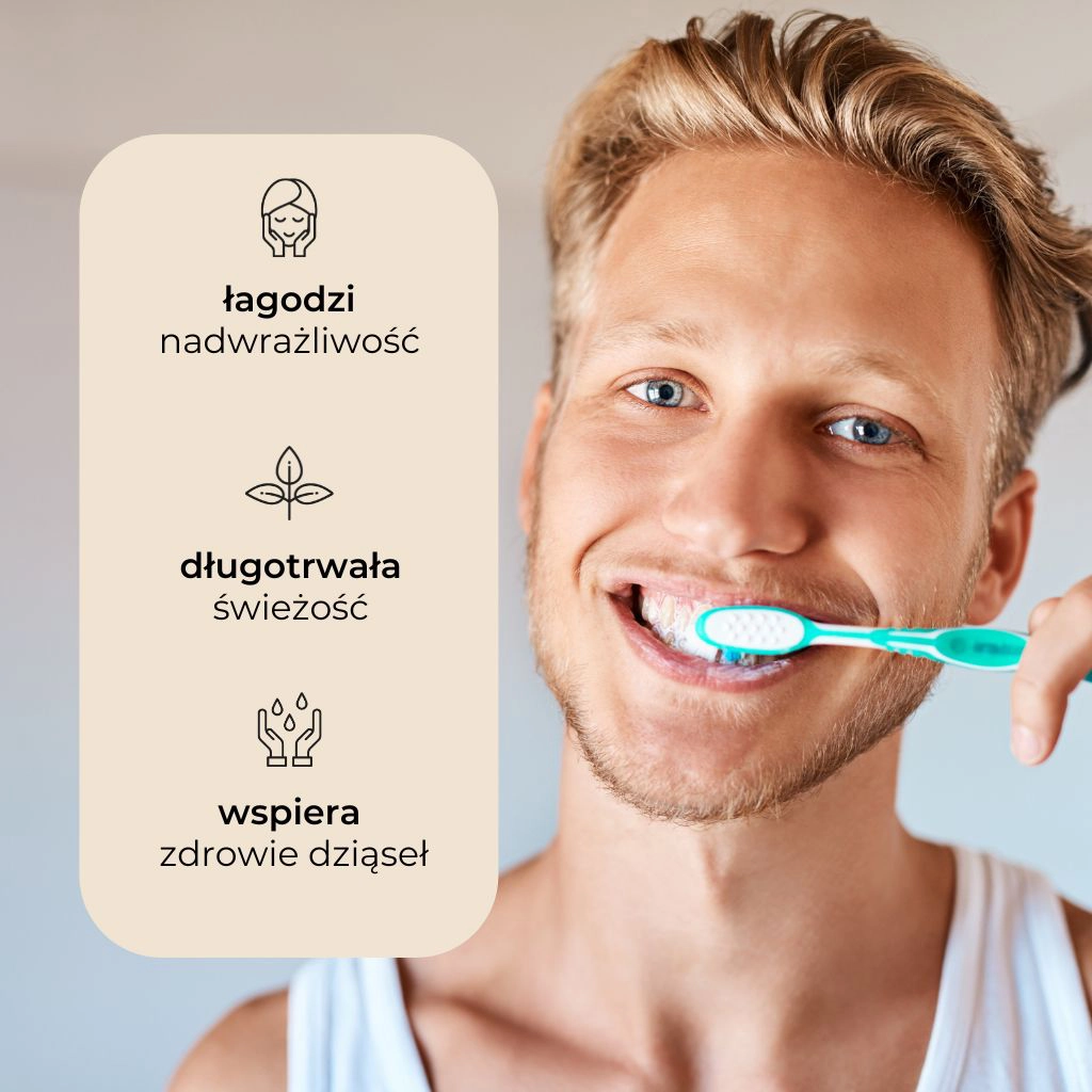 Ta pasta to idealna opcja dla osób poszukujących naturalnej pasty do zębów, która nie tylko odświeża, ale też wspiera dziąsła i pomaga łagodzić nadwrażliwość – bez kompromisów w codziennej higienie.