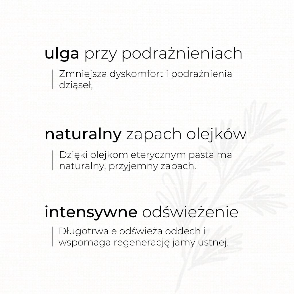 To idealna opcja dla osób, które szukają naturalnej pasty do zębów bez fluoru i jednocześnie chcą wyrazistego efektu odświeżenia. Intensywnie miętowy charakter, eukaliptusowo-ziołowe nuty i dopracowana receptura sprawiają, że każde szczotkowanie daje uczucie czystości „jak po profesjonalnym odświeżeniu”.