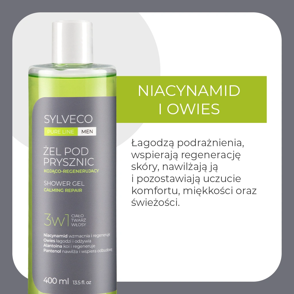 Niacynamid, panthenol oraz alantoina działają łagodząco i regenerująco, wspierając skórę narażoną na podrażnienia. Hydrolizowany owies dodatkowo koi i wzmacnia barierę ochronną skóry. Składniki te pomagają zmniejszyć uczucie dyskomfortu, szczególnie po goleniu lub intensywnej aktywności fizycznej. Regularne stosowanie sprawia, że skóra wygląda zdrowiej i jest bardziej odporna.